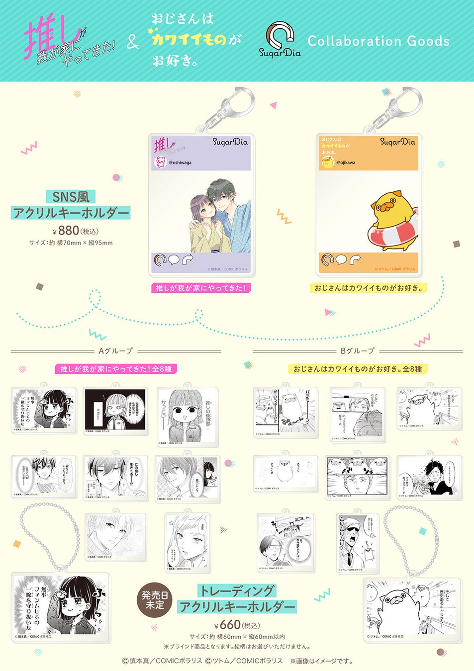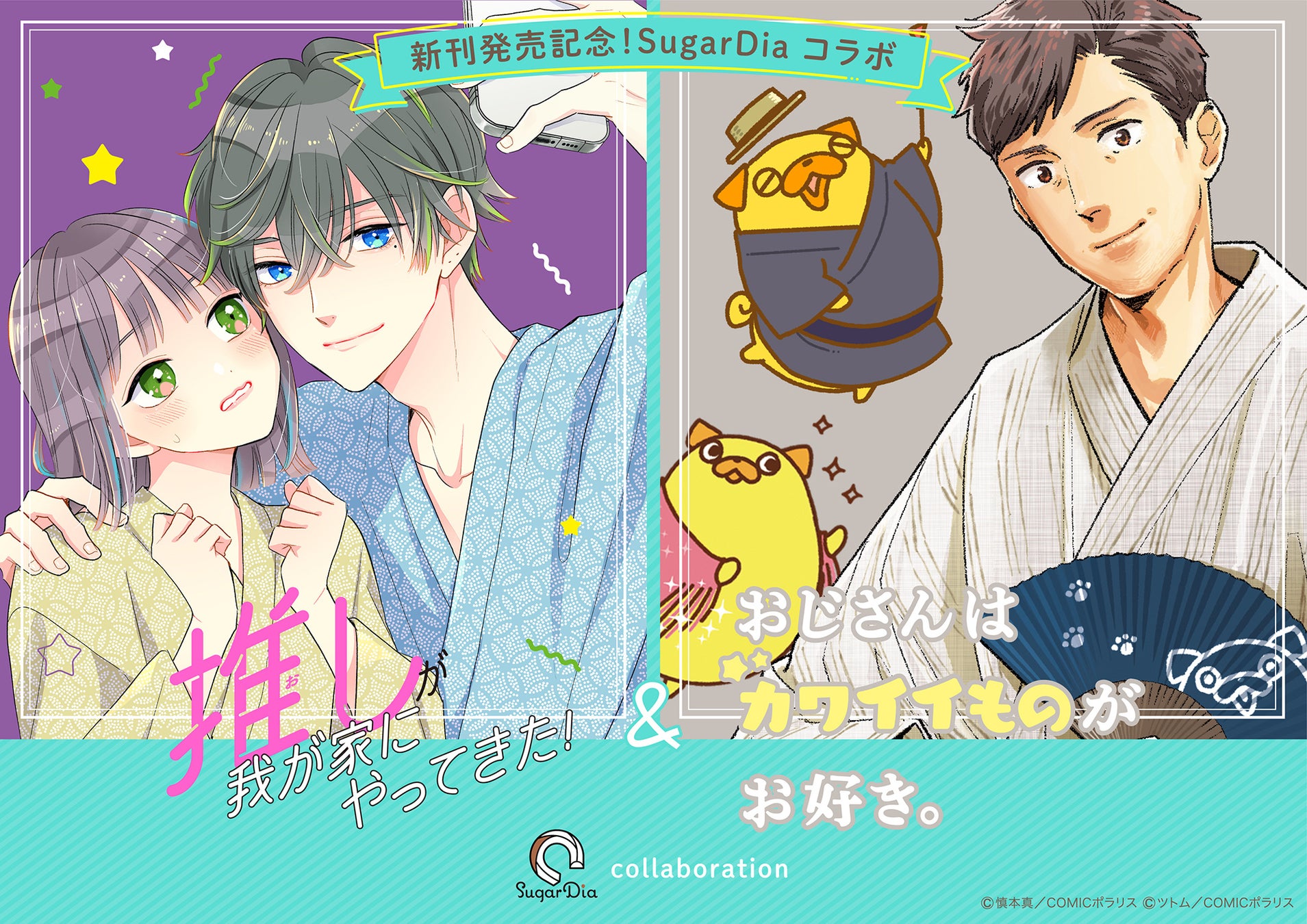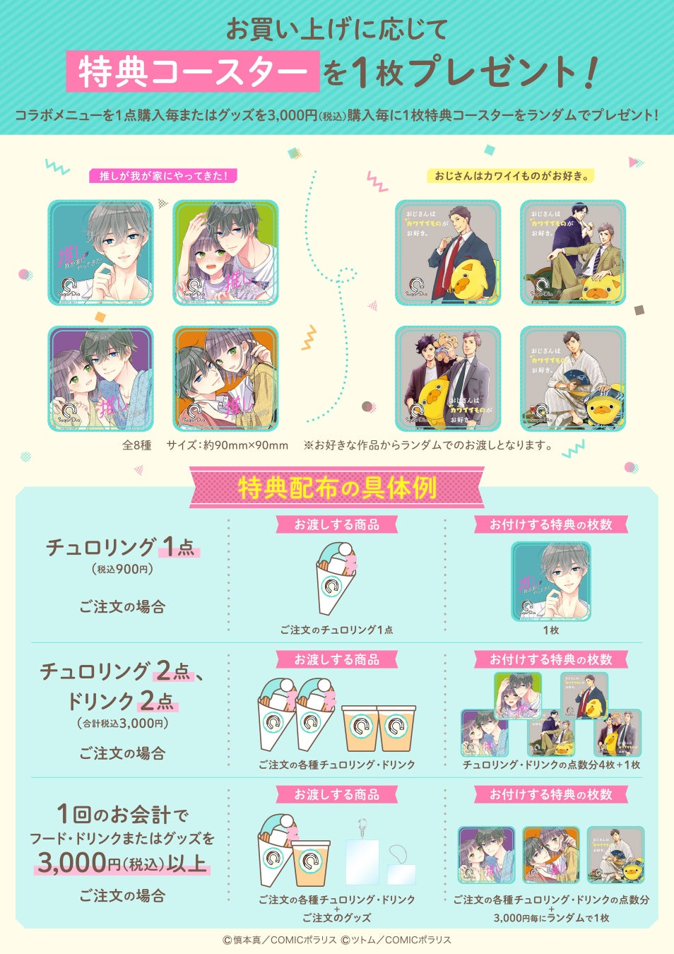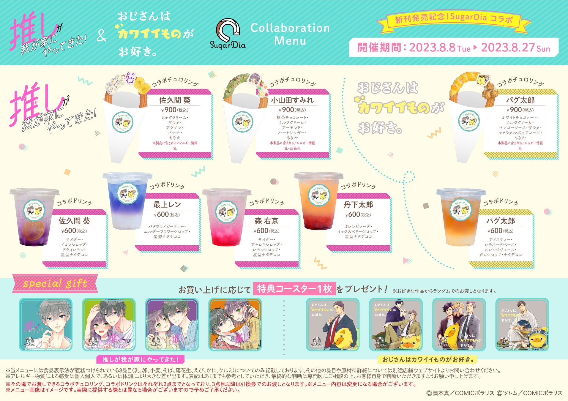 フレックスコミックス『推しが我が家にやってきた!』『おじさんはカワイイものがお好き。』の新刊発売を記念して、コラボ開催期間中「SugarDia 原宿」にて、キャラクターをイメージしたコラボチュロリングやドリンク、コラボグッズを販売いたします。