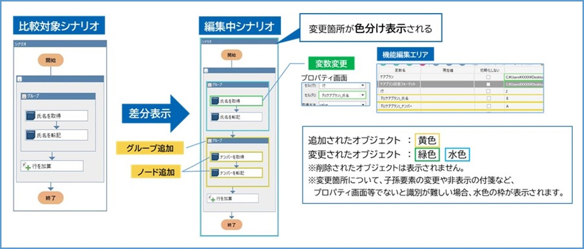 ・比較対象シナリオからの変更点・追加点を、視覚的に判別可能な色枠で表示