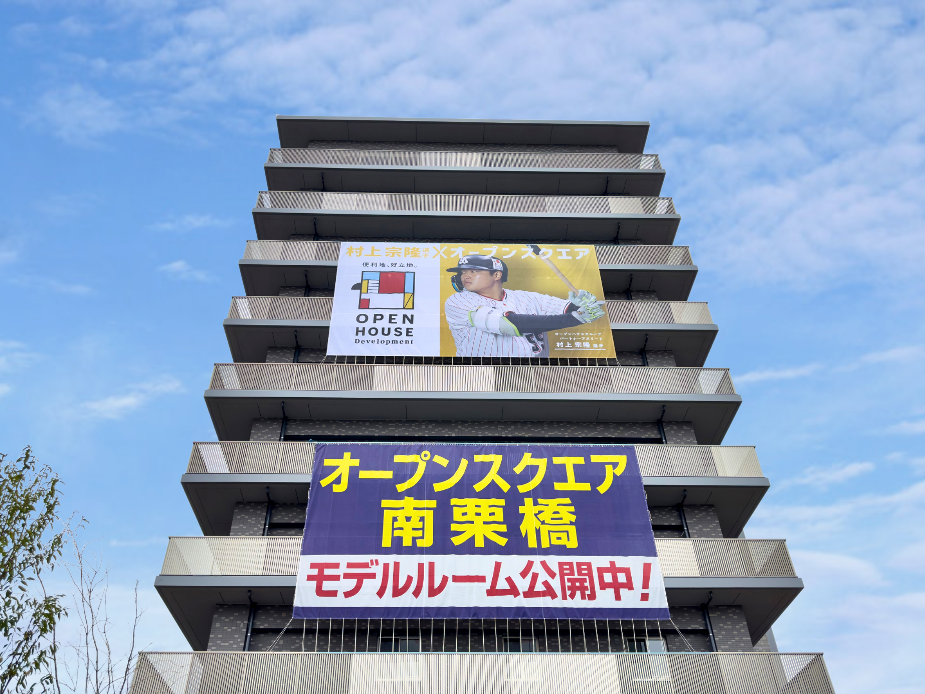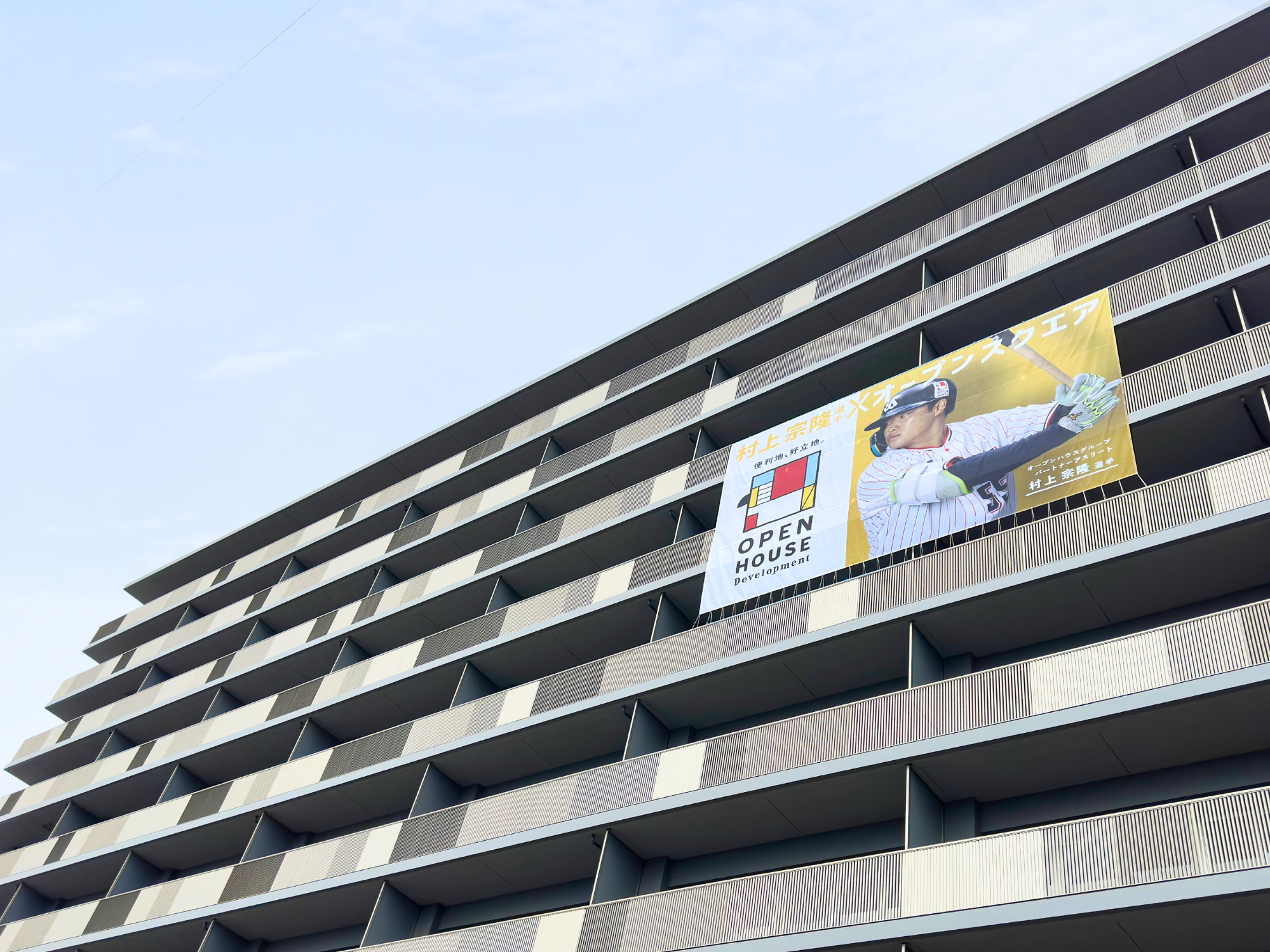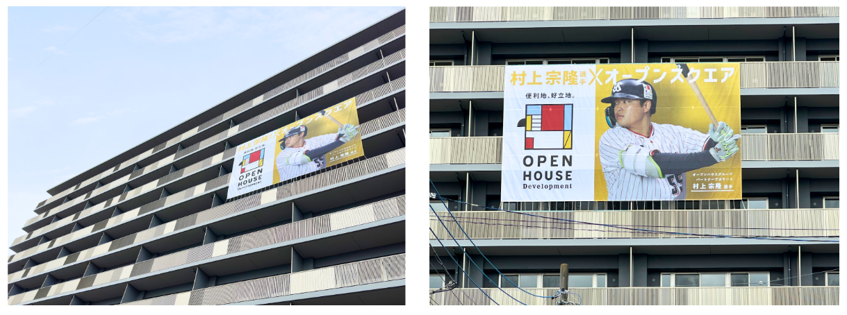 当社は今月1日に、東京ヤクルトスワローズ・村上宗隆選手とパートナーアスリート契約を締結いたしました。その第一弾として、新築マンション「オープンスクエア南栗橋」に横9m✕縦5.4mの巨大イメージシートを掲示いたしました。村上選手の凛々しい横顔が、マンション正面・側面の3箇所に飾られます。駅から徒歩3分と近く、また周囲に高い建物がないため、南栗橋駅のホームからもご覧いただけます。