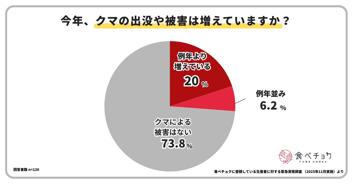 2025年にクマの出没や被害について「例年より増えている」と回答した生産者は20%。「例年並み」と回答した6.2%を合わせると、全国の26.2%がクマの出没や被害の増加を実感していることが分かりました。