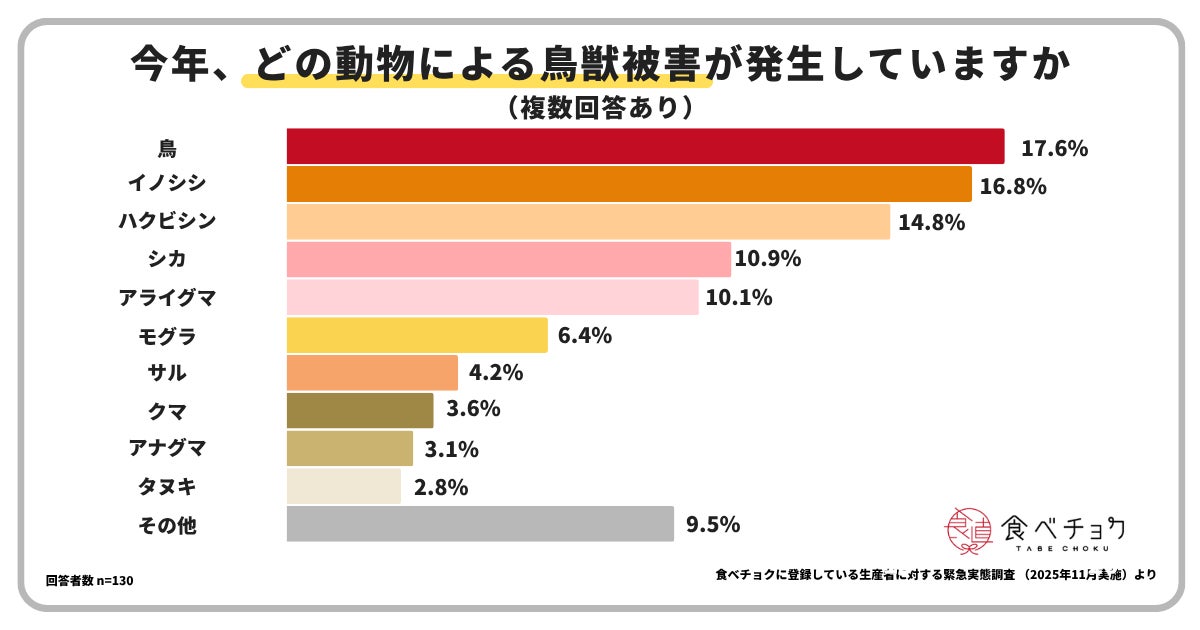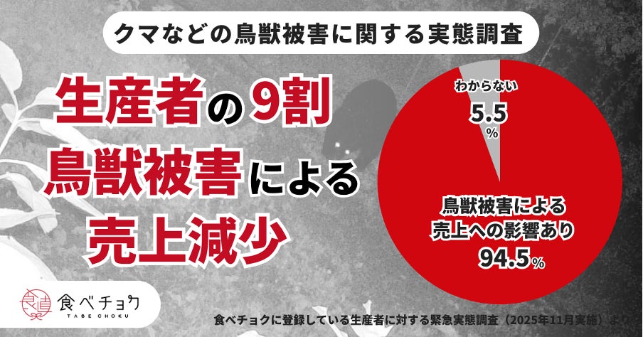 今年に入り、全国的にクマによる被害が増加しており、生産者から「被害が深刻」「対策費がかさむ」といった声が多く寄せられています。そこで食べチョクは、クマをはじめとする鳥獣被害が生産現場に与える影響や、各生産者の対策状況を把握するため、緊急アンケート調査を実施しました。