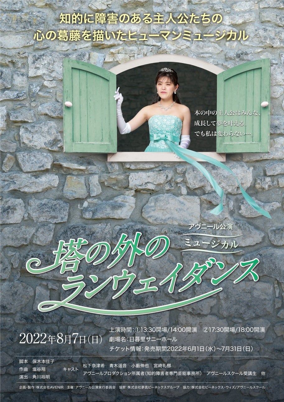 株式会社ツインプラネット(東京都渋谷区 代表取締役 矢嶋健二)所属の後藤萌咲が2022年8月7日(日)より上演される知的障害者専門の芸能プロダクション・アヴニールが企画制作を務めるミュージカル「塔の外のランウェイダンス」に出演いたします。