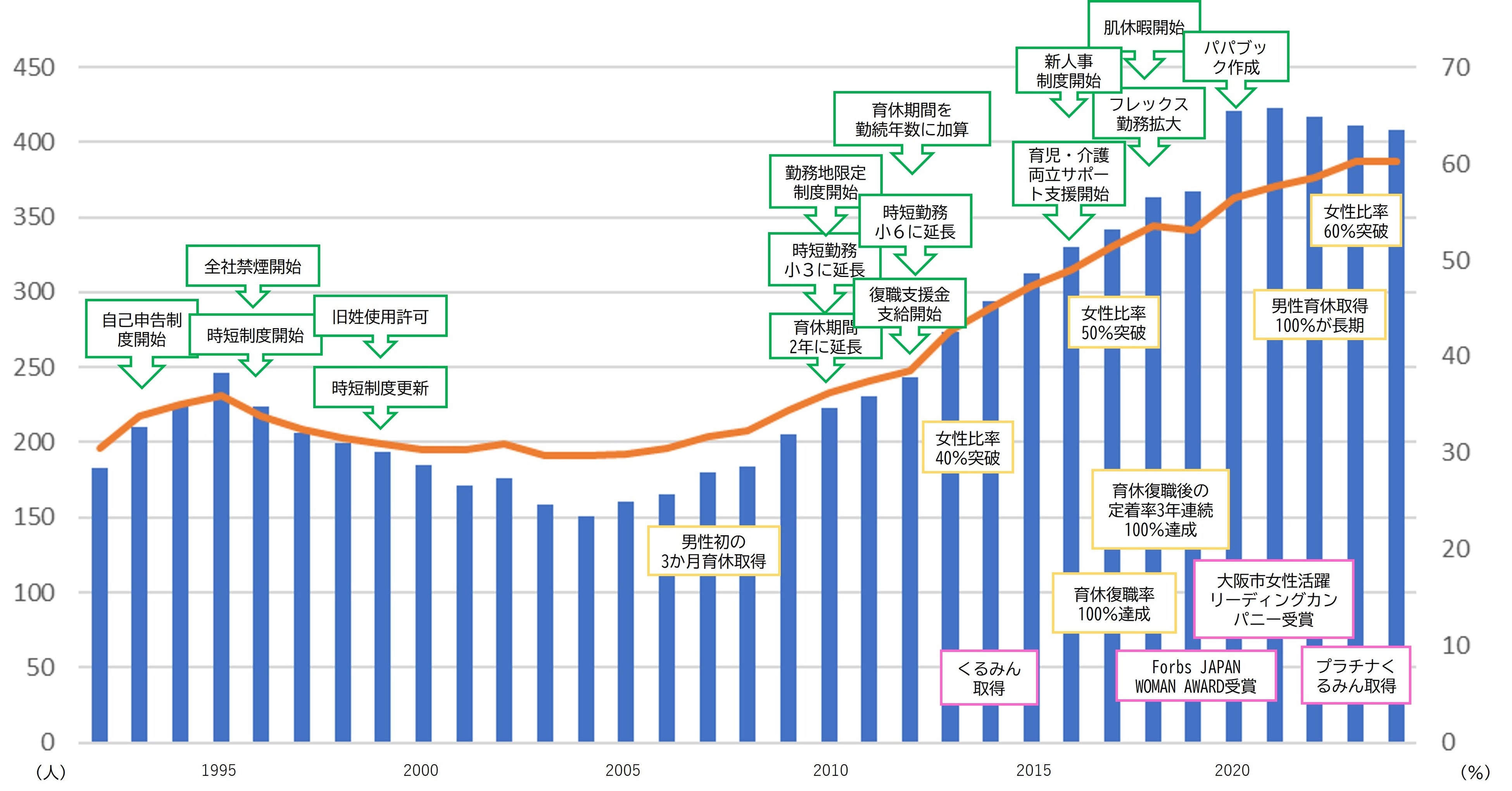 株式会社ナリス化粧品(代表者:村岡弘義 本社:大阪市福島区)は、30年以上前から男女を問わず働きやすい環境の整備に取り組んでおり、今年3月末には女性社員の割合が60.2%と6割を突破しました。1990年代前半に取り組みを始めて15年程度は成果は芳しいものではありませんでしたが、あきらめずに制度を更新したり追加するといった地道な取り組みによる結果であり、その取り組みを以下にまとめます。