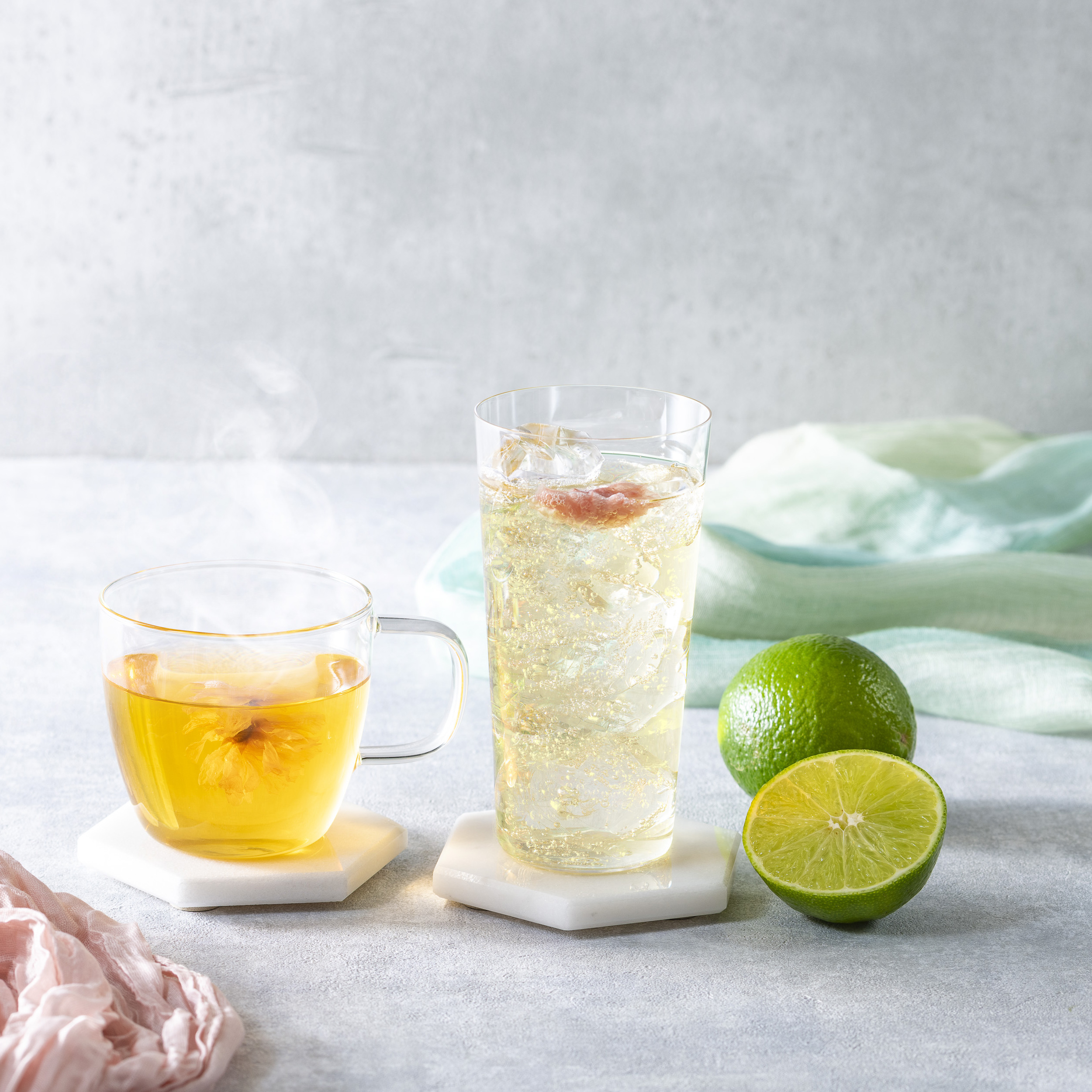 ROKU〈六〉ブロッサムブリーズ:宇治茶を漬け込んだROKU〈六〉に桜の香りを重ねた春の一杯。ライムと抹茶の甘みを軽やかなソーダがまとめ、桜花が花見の趣を添える上品な味わいです。