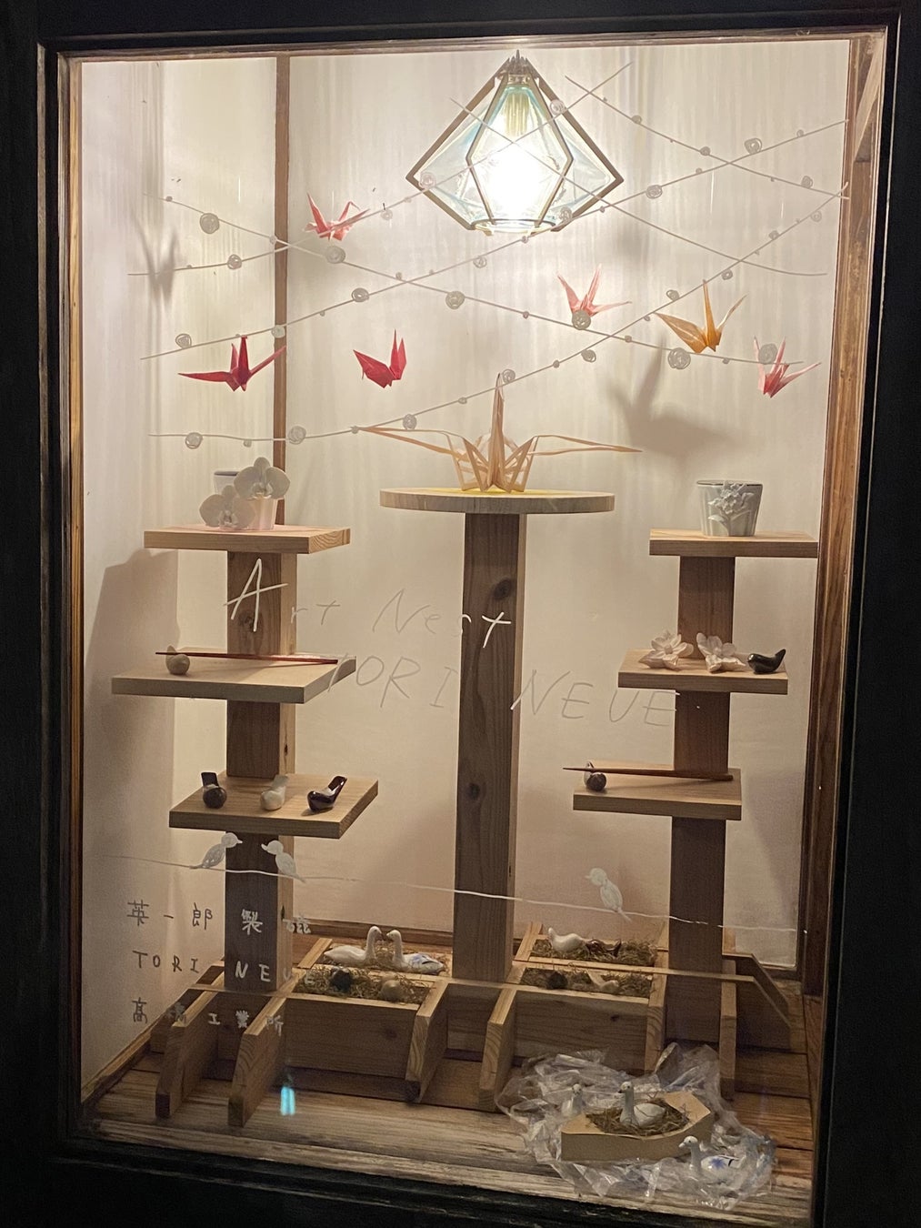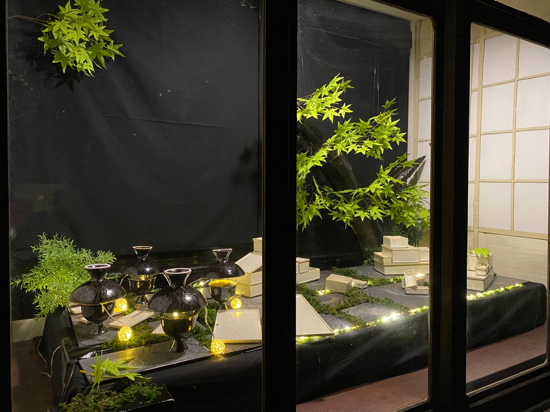 コンセプトは海外の観光客が日本の文化をイメージしやすいように「日本庭園」にしました。全体のバランスを意識して視線を1箇所に集めすぎないようにしました。1番見せたい抹茶碗を軸に周りに別の商品を配置し、それぞれの魅力が伝わるようにしました。