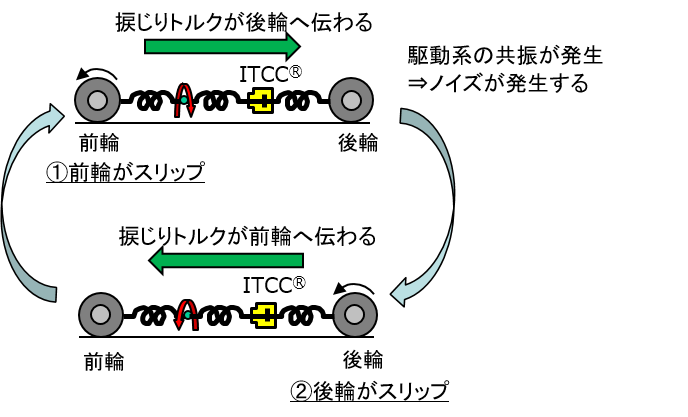 「オンデマンド4WDシステム」では、滑りやすい路面での発進時に、前輪と後輪で駆動力が伝わる時間に差が生まれると、前輪と後輪が交互にスリップします。これにより駆動系の部品がねじれることで共振(ねじり共振)が起こり、不快な突き上げ音(ノイズ)が発生する一因となっていました。