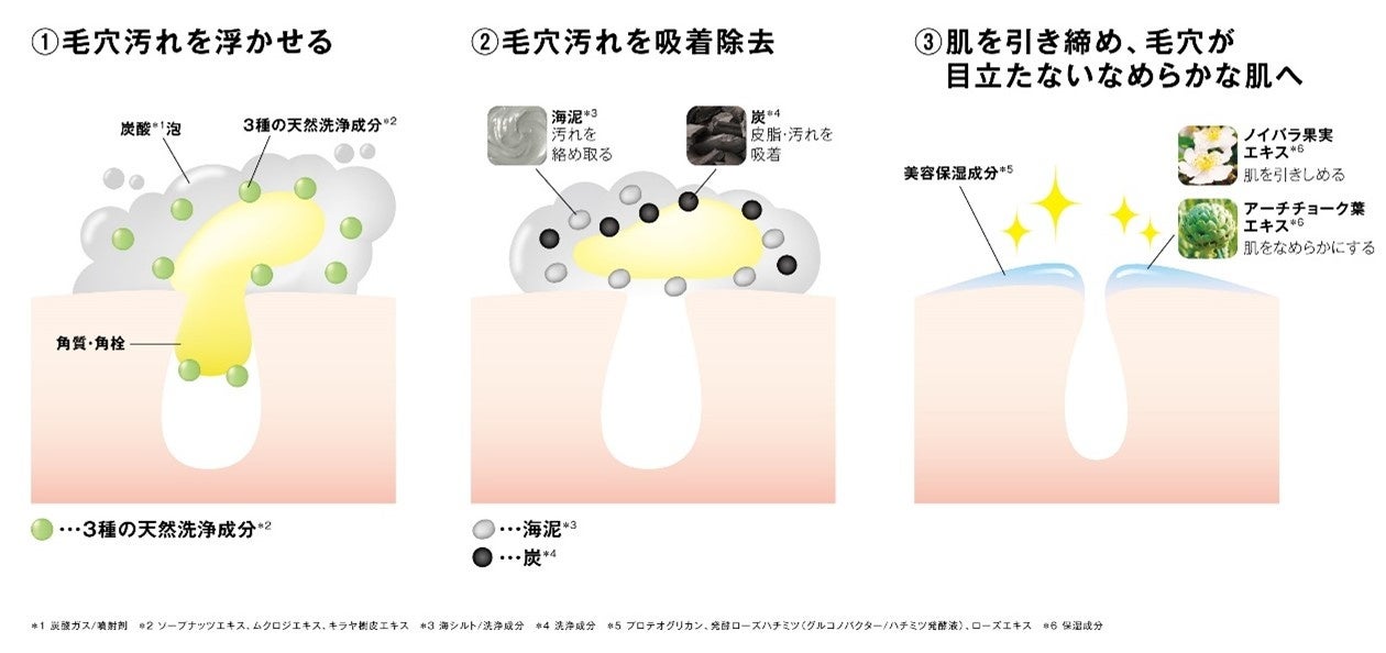 炭酸※1濃密泡と3種の天然洗浄成分※4が毛穴汚れを浮かせ、泥※2と炭※3が毛穴汚れをしっかり吸着し絡めとります。さらに、炭酸※1配合のため優しくマッサージすることで血行を促進し、くすみ※5もケアします。