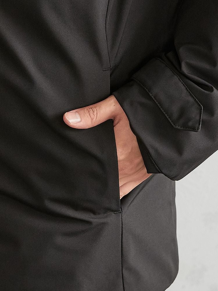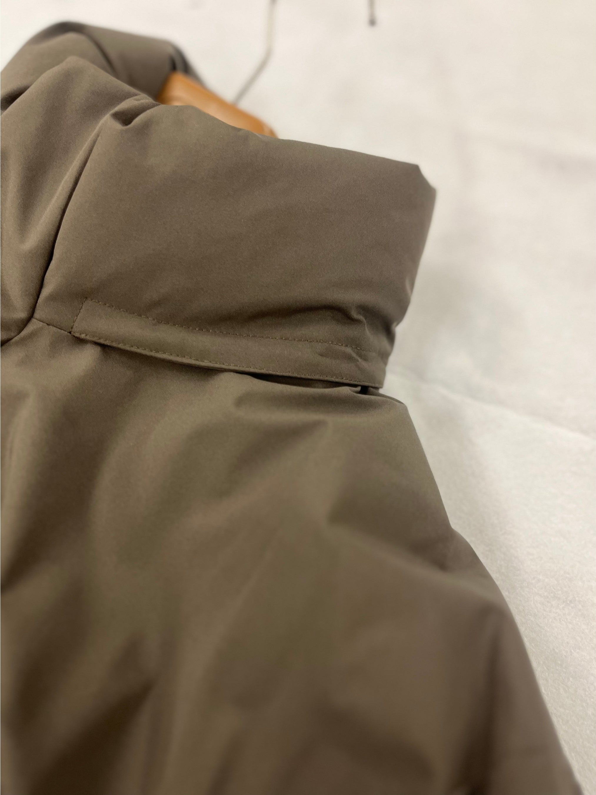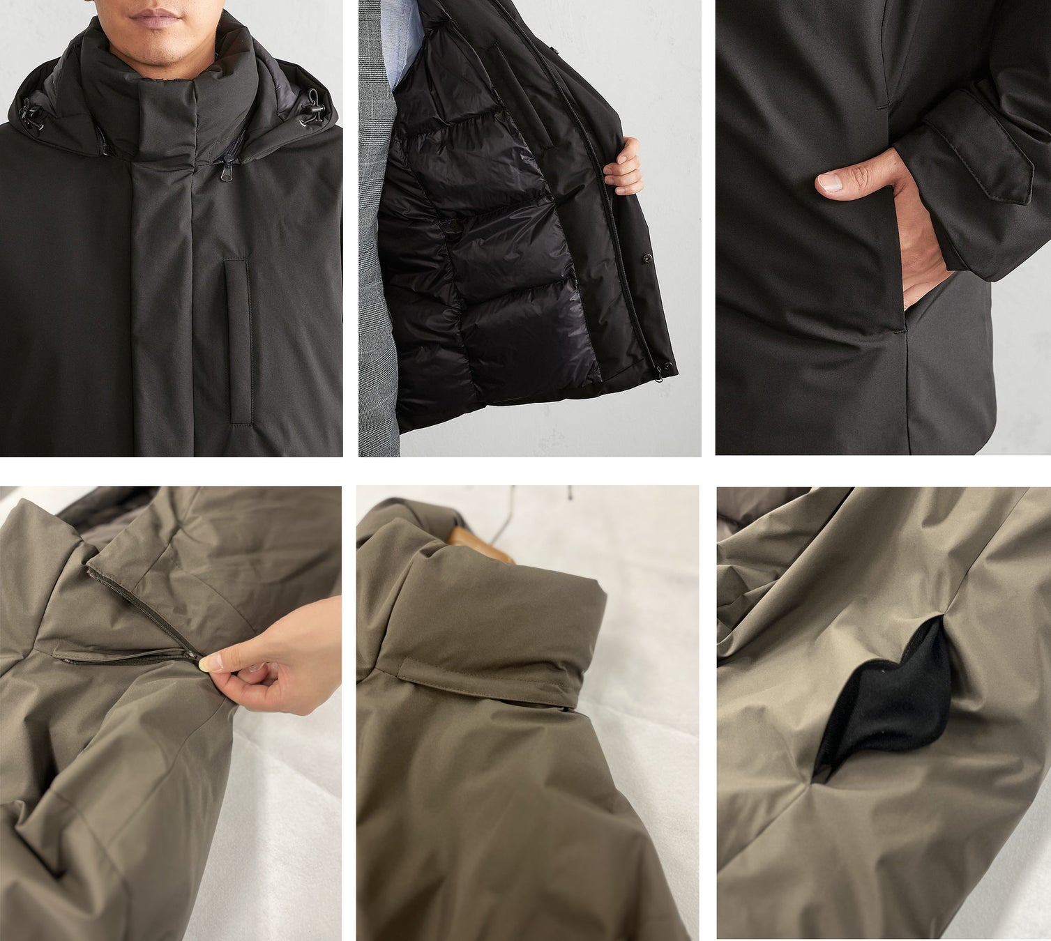 また、表地に撥水加工、防風フィルムを使用しており雨風や雪の日の着用が可能。機能性も兼ね備えた1着です。