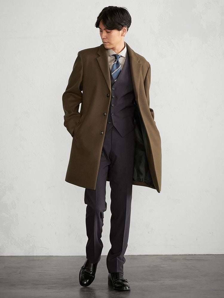 TOKYO RUNでは、ビジネスシーンに沿ったデザインのチェスターコートも展開しております。かっちりしたクラシックなデザインがお好きな方や、お仕事着とプライベート着を切り替えたい方にはこちらのチェスターコートがオススメです。