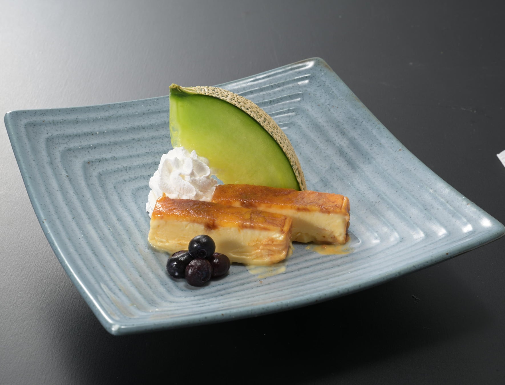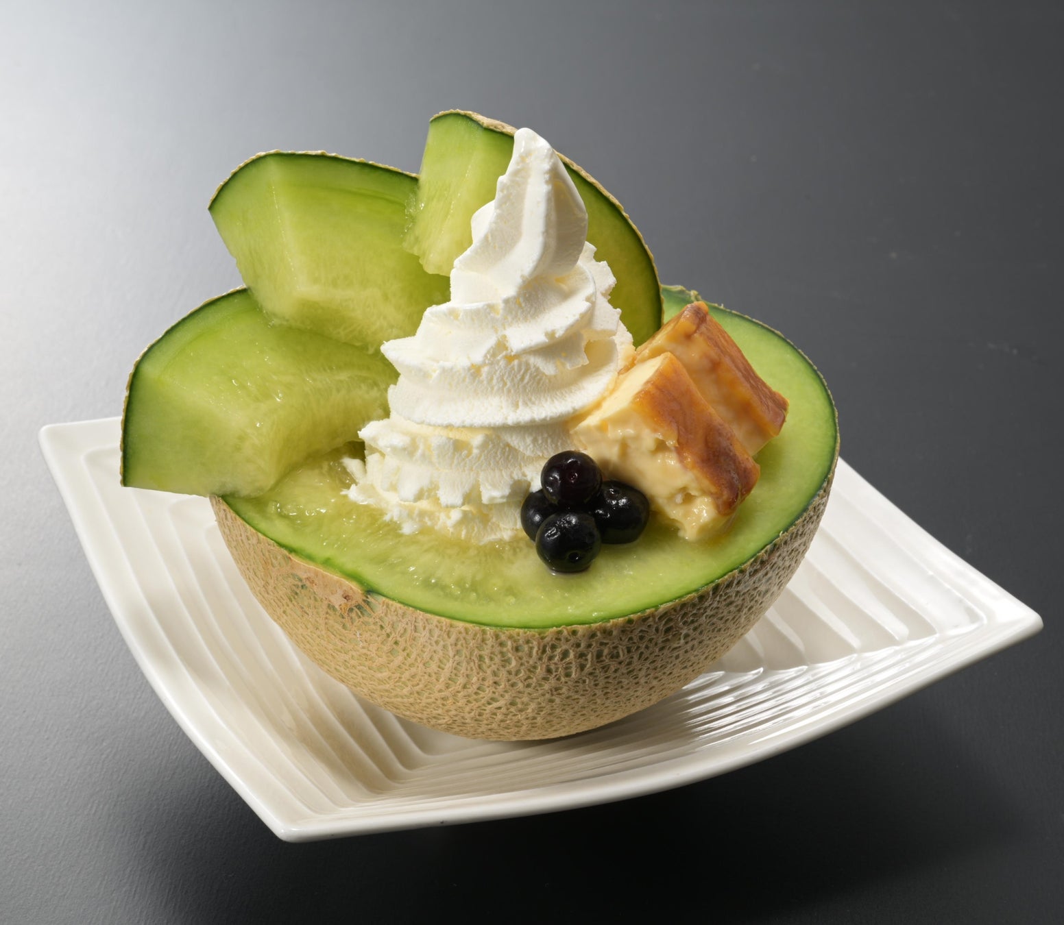 爽やかな甘みが特徴の青肉メロンと、北海道・花畑牧場が誇る「十勝カタラーナ」を組み合わせた一皿。