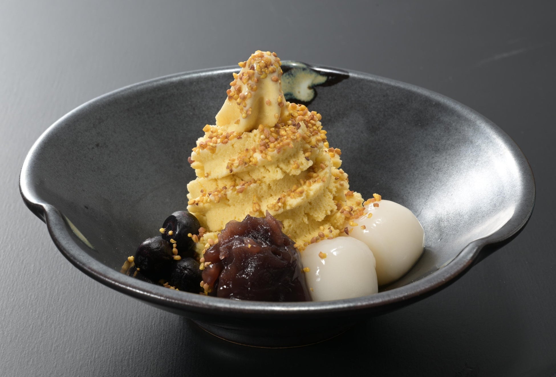 北海道産韃靼そば“満天きらり”のそば粉の風味を活かし、甘すぎず、舌触りのよいアイスに仕上げました。北海道産小豆の粒あんと白玉、甘酸っぱいブルーベリーを添えて、最後にローストした“満天きらり”の実を振りかけることで、さらに香ばしく、そばの実の豊かな風味と味わいを感じていただける逸品です。