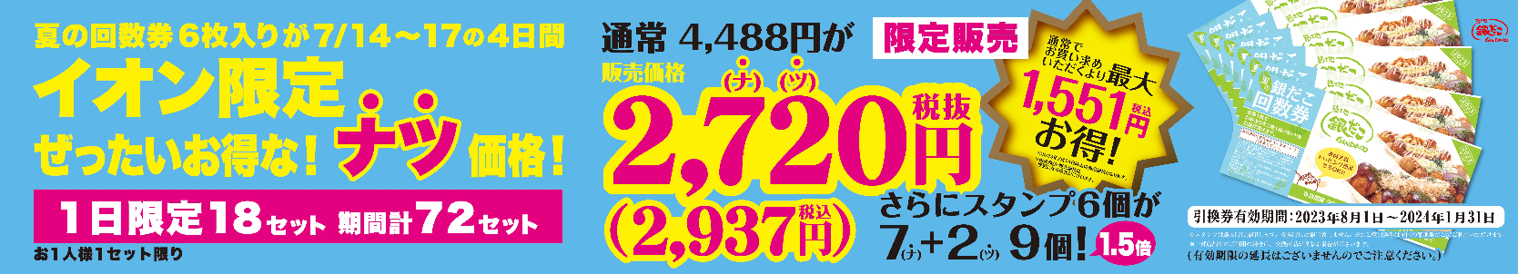 今回は、大人気の “ぜったいお得な” 「夏の回数券」 を、「イオン 超!ナツ夏祭り」の限定商品として 『6枚入りセットを各店各日18セット・期間合計で72(ナツ)セット限定でご用意!』 さらに!ご購入時に銀だこスタンプカードのスタンプが通常回数券の枚数分(6個)のところ、7(ナ) + 2(ツ) = 9個もらえる特別企画!