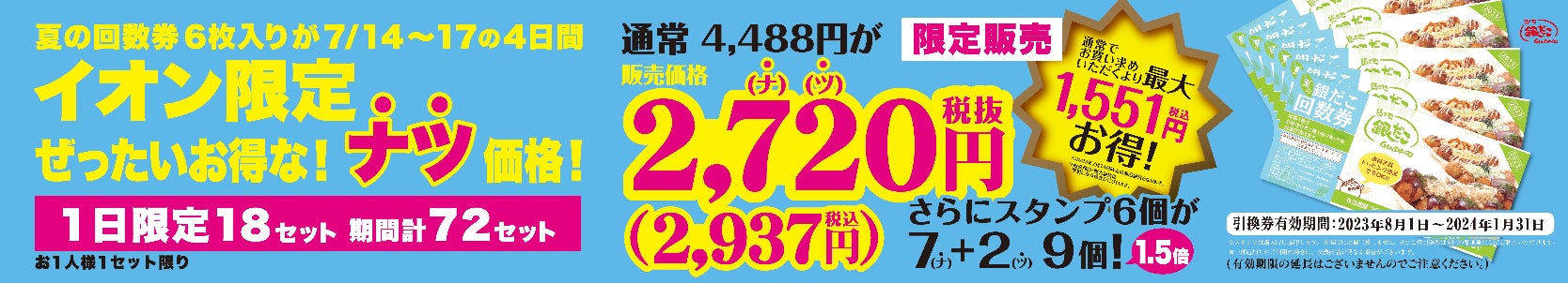 \イオン ・イオンモール限定/ 銀だこ回数券(6枚入り)が “ナツ価格 ” 2,720円(税込2,937円)!