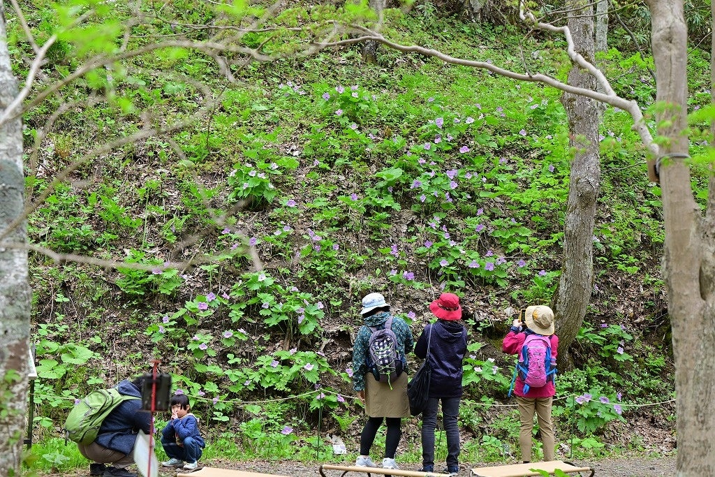 森の情報館から徒歩10分ほどのところにある「シラネアオイの小径」では毎年500本以上の花が見られ、エリア全体で1,500本ほどの花を見ることができます。