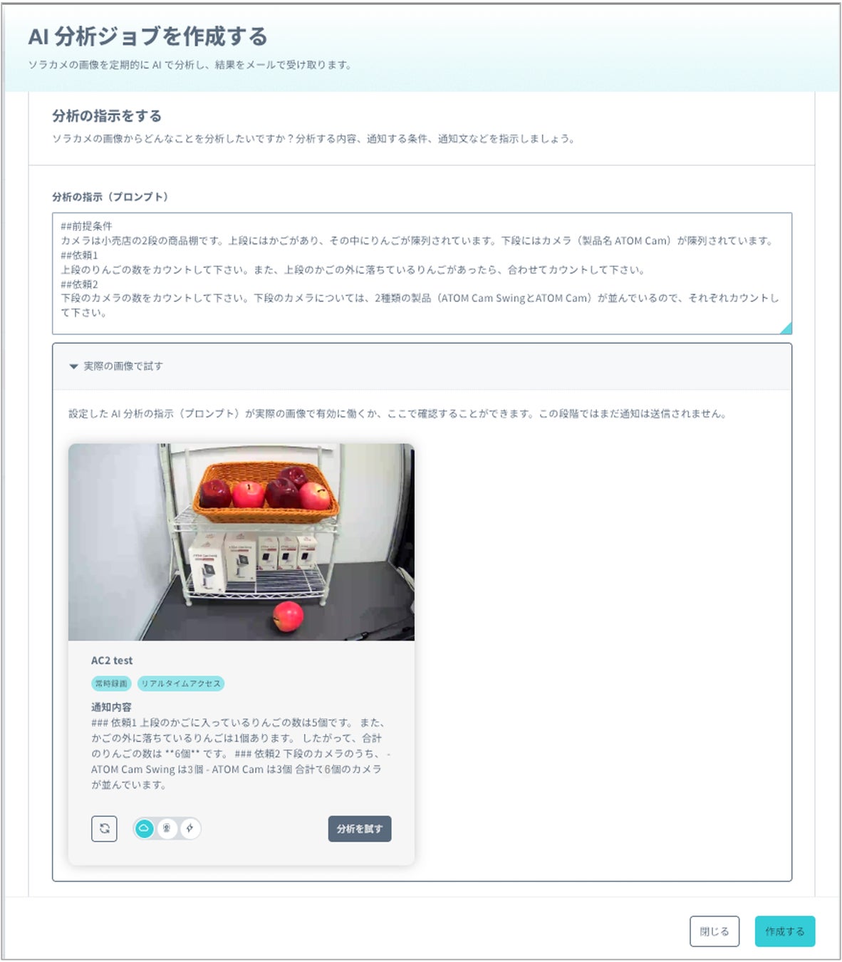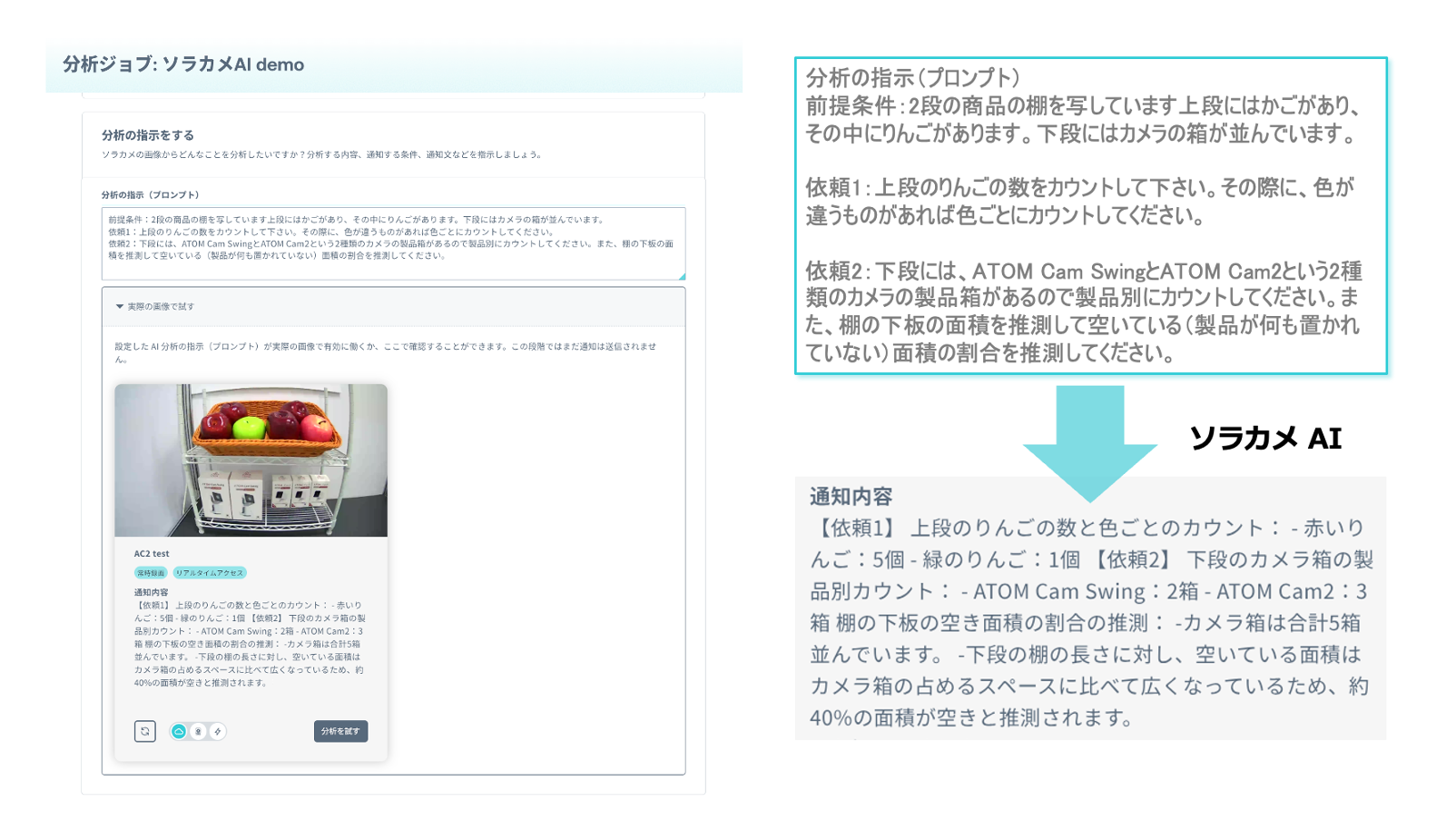 今回の新機能「ソラカメAI」は、こうした現場の声に応え、カメラの映像に対して、日本語でAI分析の指示、分析のタイミングやメールの通知先を設定するだけで、結果を自動的にメールで受け取ることができます。