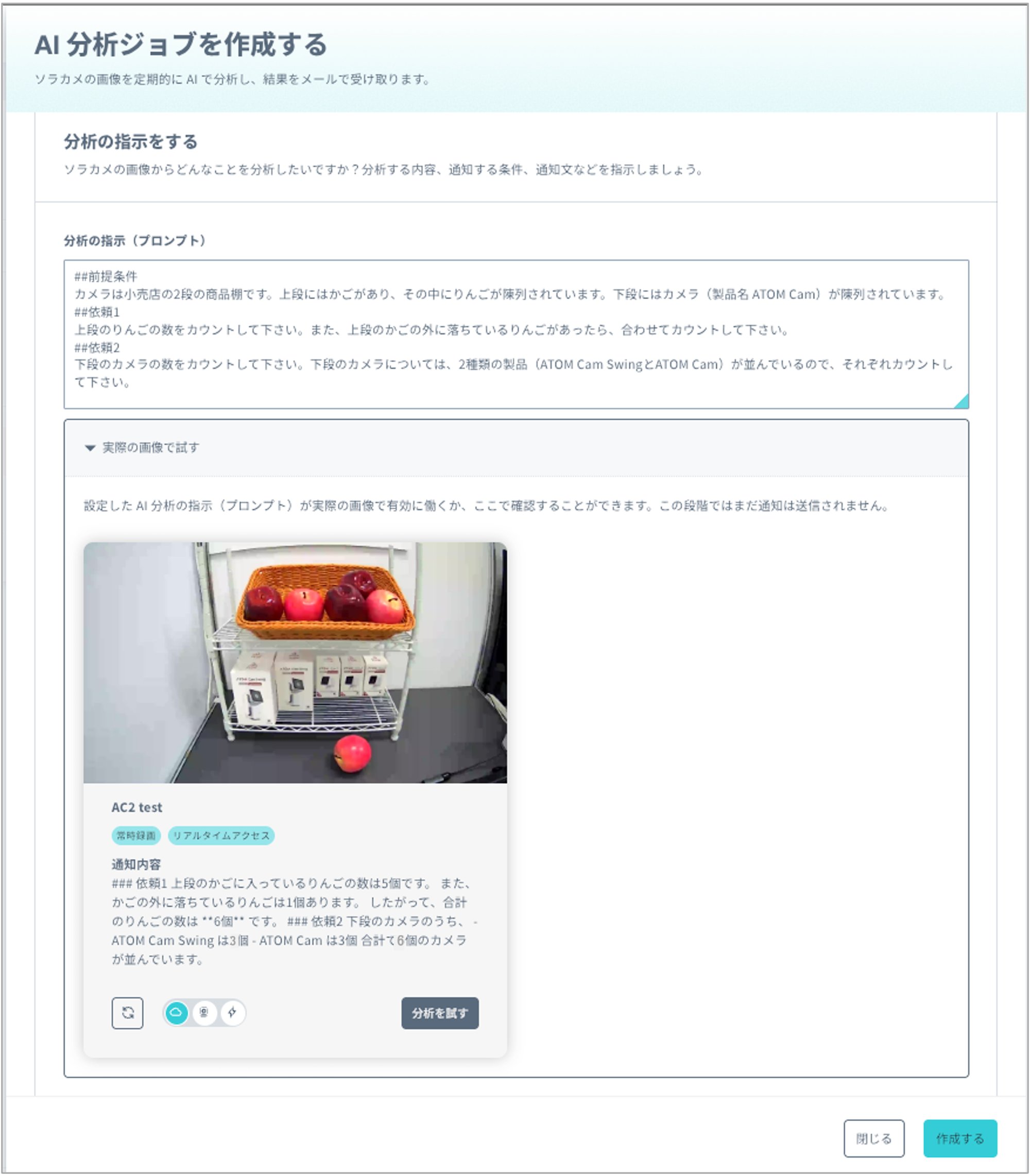 分析したいカメラを選択し、日本語のテキストでAIに分析させたい内容を記述