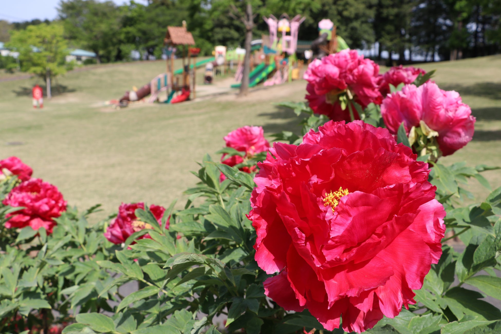 ぼたん以外には、シャクヤク、アジサイやイロハモミジ、ロウバイなども植栽しており、大型複合遊具や芝生広場、展望台などもあり年間を通してお楽しみいただけます。