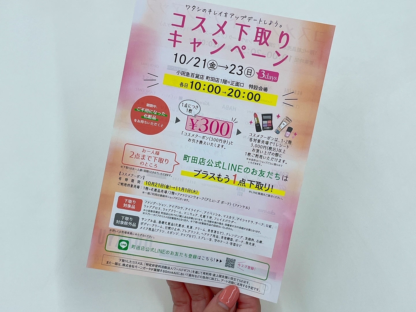 期間中、不用となった化粧品をお持ちいただくと、1点につき1枚、「コスメクーポン(300円分)」と引き換えます。下取りはお一人様1回につき2点までで、町田店公式LINEのお友だちは、さらにもう1点下取りします。(小田急百貨店町田店以外での購入品も対象)