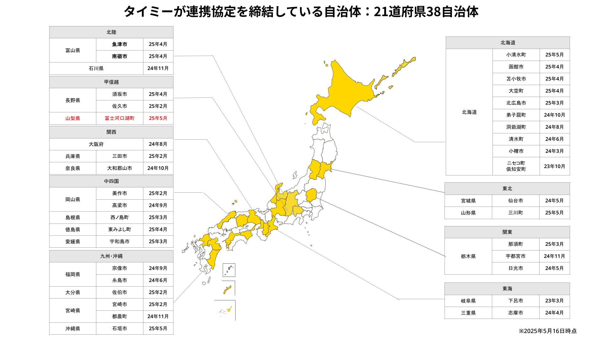 当社はこれまで20道府県・37自治体と連携協定を締結しており、今回の連携協定は21道府県・38自治体目となります(※2)。なお山梨県における自治体連携は、今回が初となります。