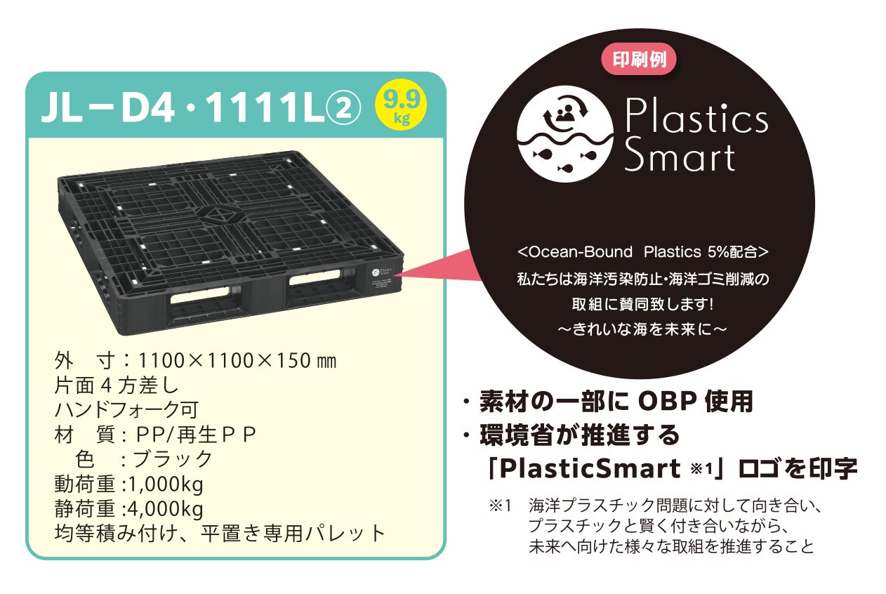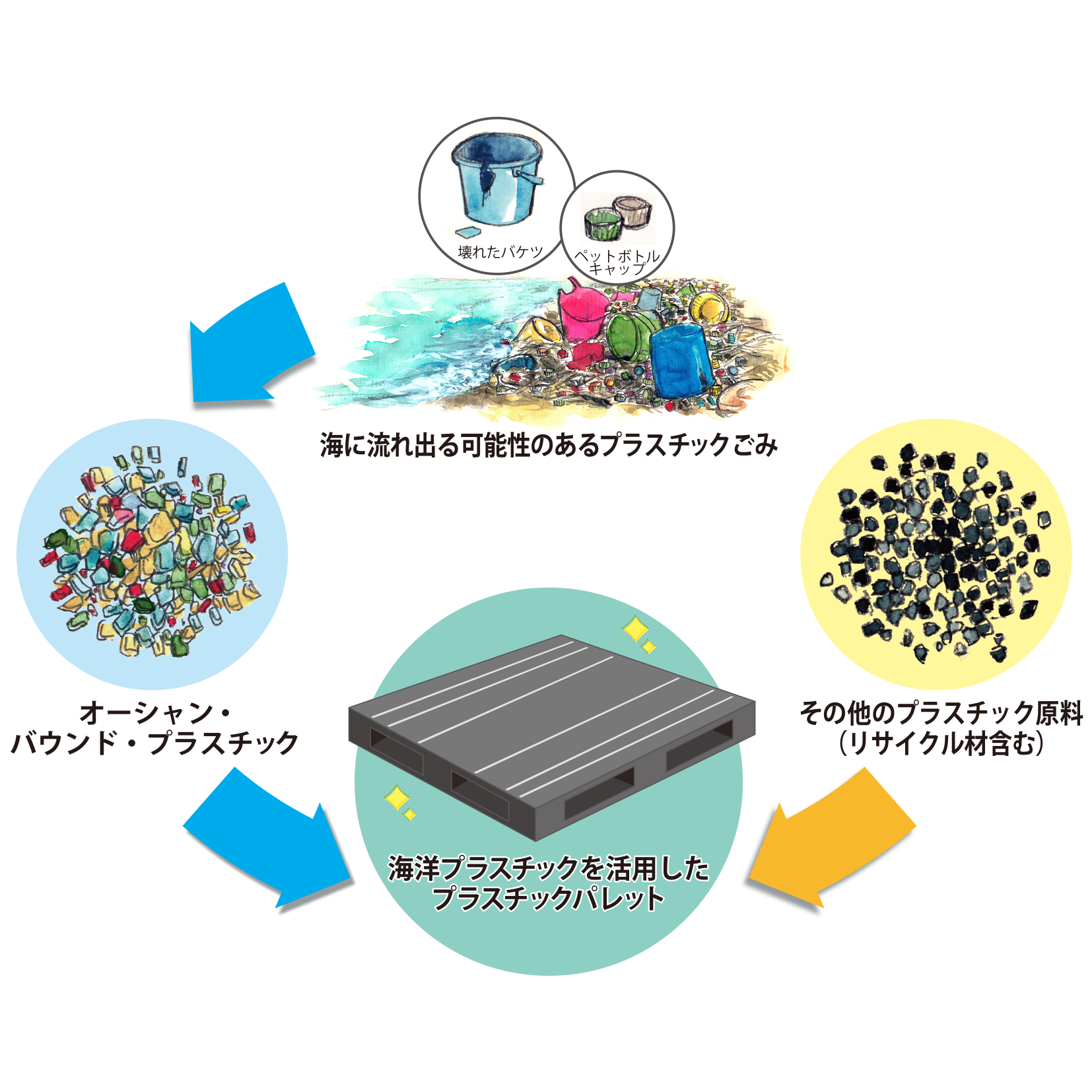 近年、廃プラスチックによる環境問題が世界的に注目を集めていますが、なかでも海中、海辺に捨てられた海洋プラスチックごみが大きな問題となっています。今回採用したパレットは、バージン材と比較しCO₂削減効果の大きい再生材を使用したパレットに海洋プラスチックごみをアップサイクルし、リサイクル材として一部活用することで、世界的に問題となっている海洋プラスチックごみ問題の解決に寄与することができます。