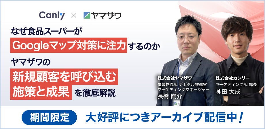 Googleビジネスプロフィール・HP・各SNSの一括管理サービス「カンリー店舗集客」の開発・提供を行う株式会社カンリー(所在地:東京都品川区、代表取締役:辰巳 衛,秋山 祐太朗)は、2025年1月28日(火)に行われたウェビナー『なぜ食品スーパーがGoogleマップ対策に注力するのか〜ヤマザワの新規顧客を呼び込む施策と成果を徹底解説〜』をご好評につき期間限定で無料配信することとなりましたのでご案内いたします。