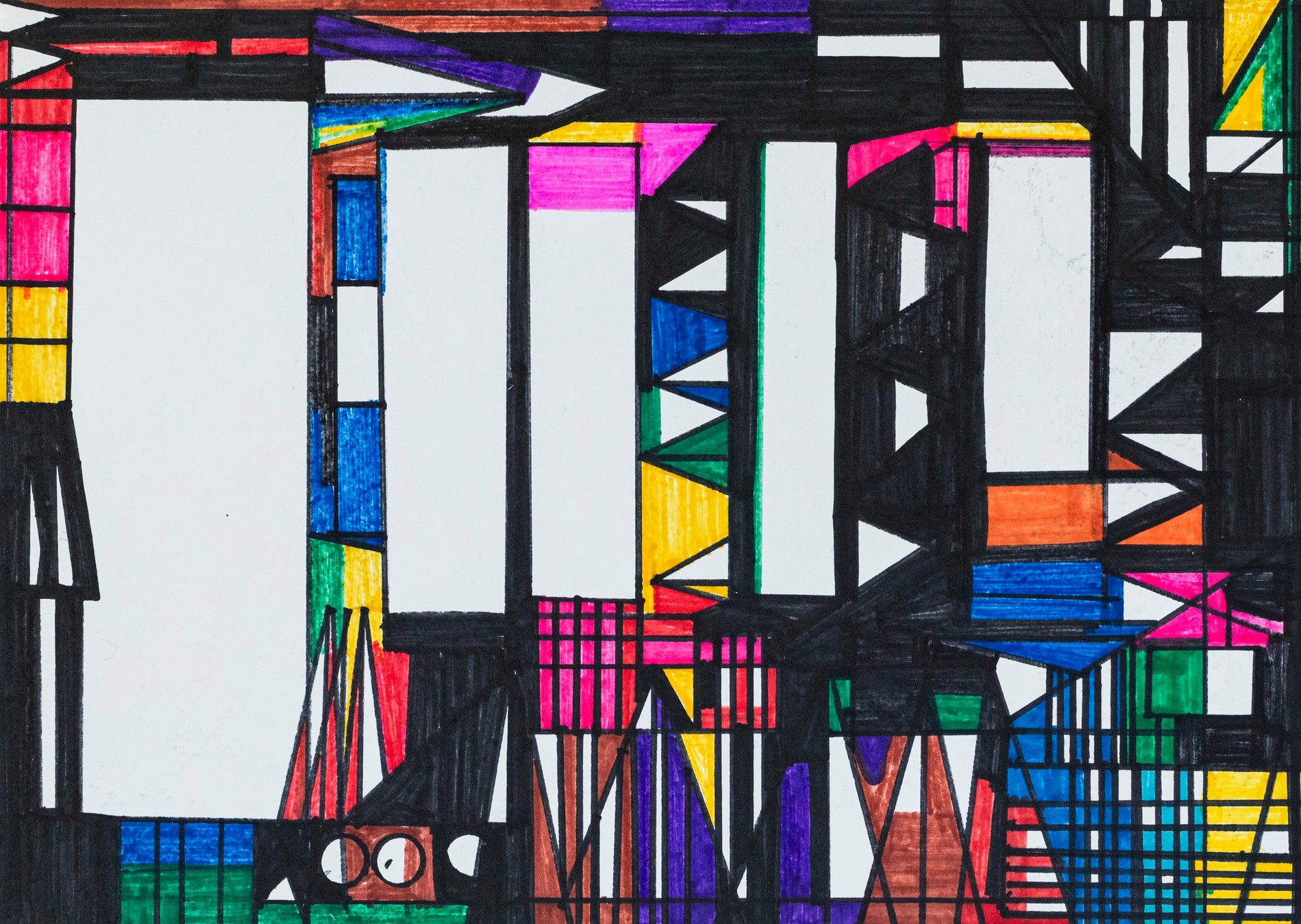 八重樫の現存する数百点に及ぶ作品群のうち、20年以上にわたって描かれた「建築物」シリーズの一点。八重樫はすべての作品において、一切の迷いもためらいもなく、始めから終わりまでを一気呵成に描き上げた。画用紙に沁み込むインクに浮かぶ線状のタッチが、「キュッ、キュッ」という音と共に規則正しくマーカーを走らせていた、その制作風景を彷彿とさせる。