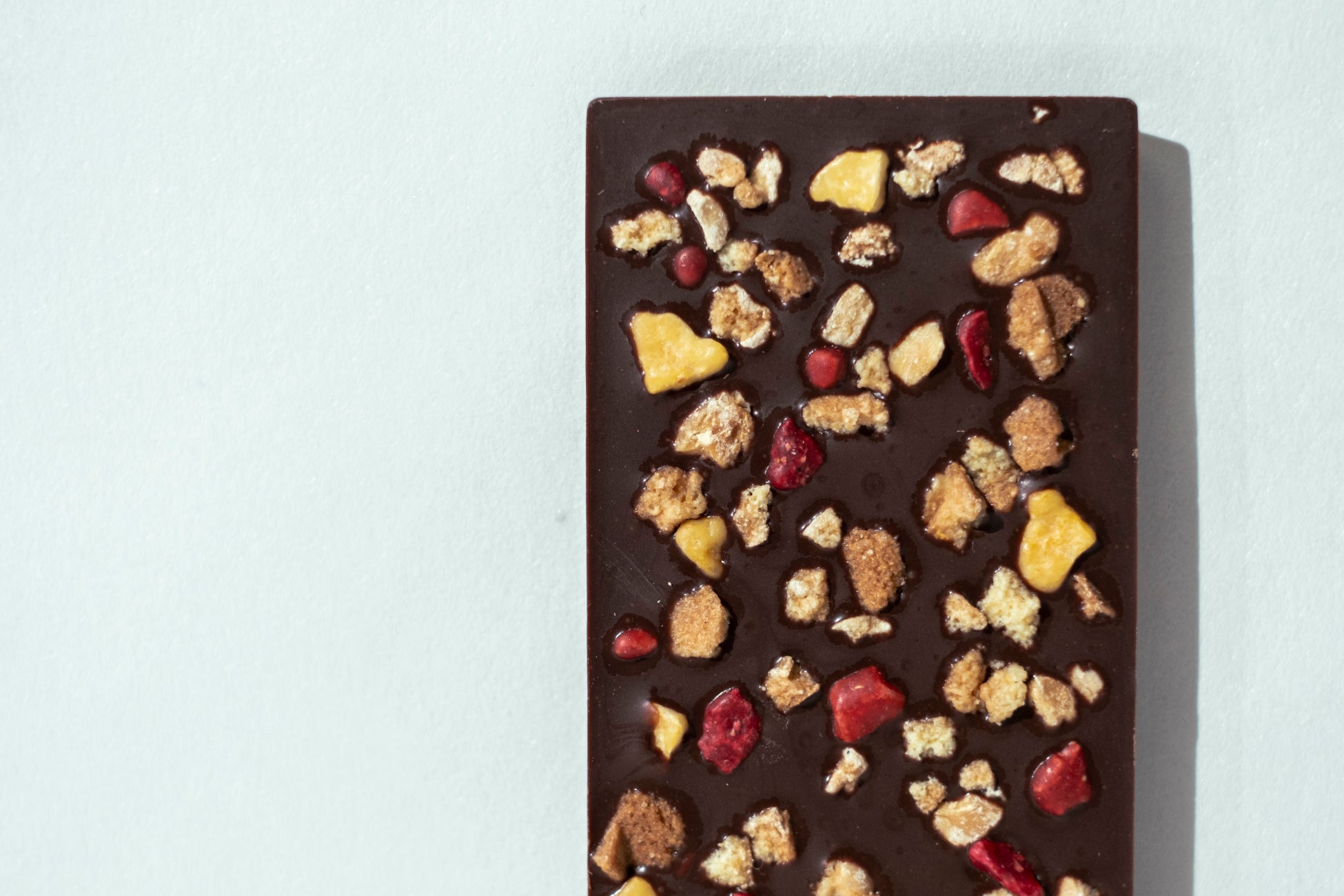 チョコレートはGreenCacao100%使用。GreenCacaoを使用することでブラジルトメアスー地方の森林を維持する活動に繋がります。トッピングは正規品とは別にはじかれる不揃いな南部せんべいのクラッシュ、ストロベリー、ラズベリー、パッションフルーツのフリーズドライを使用し、色鮮やかに仕上げました。