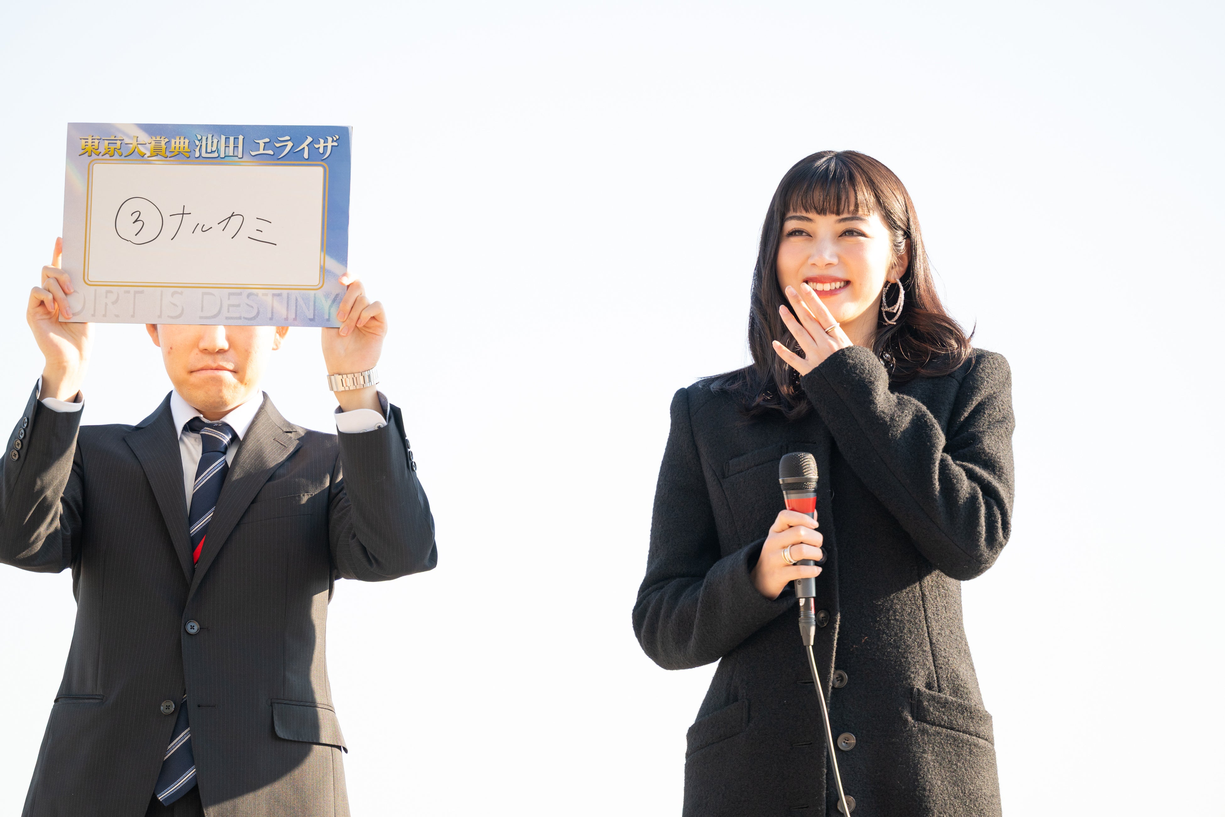 東京大賞典の注目馬はナルカミを選んだエライザさん。「ビギナーズラックを信じて、あまり深く考えても仕方がないと思いました。私の名前と同じカタカナ4文字で共通点のあるナルカミを選びました。」と、期待を込めました。