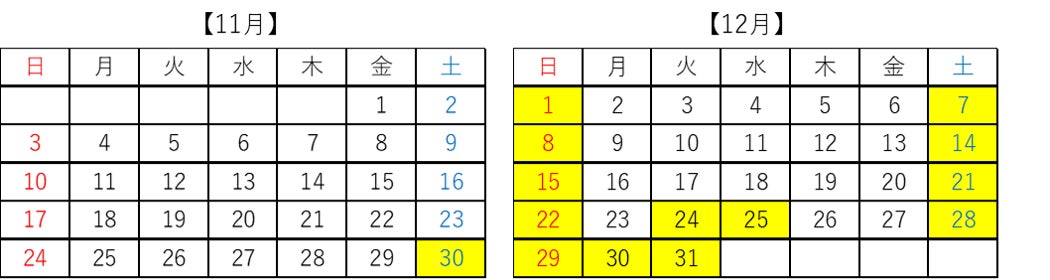 2024年11月30日(土)~2024年12月31日(火)うち14日間