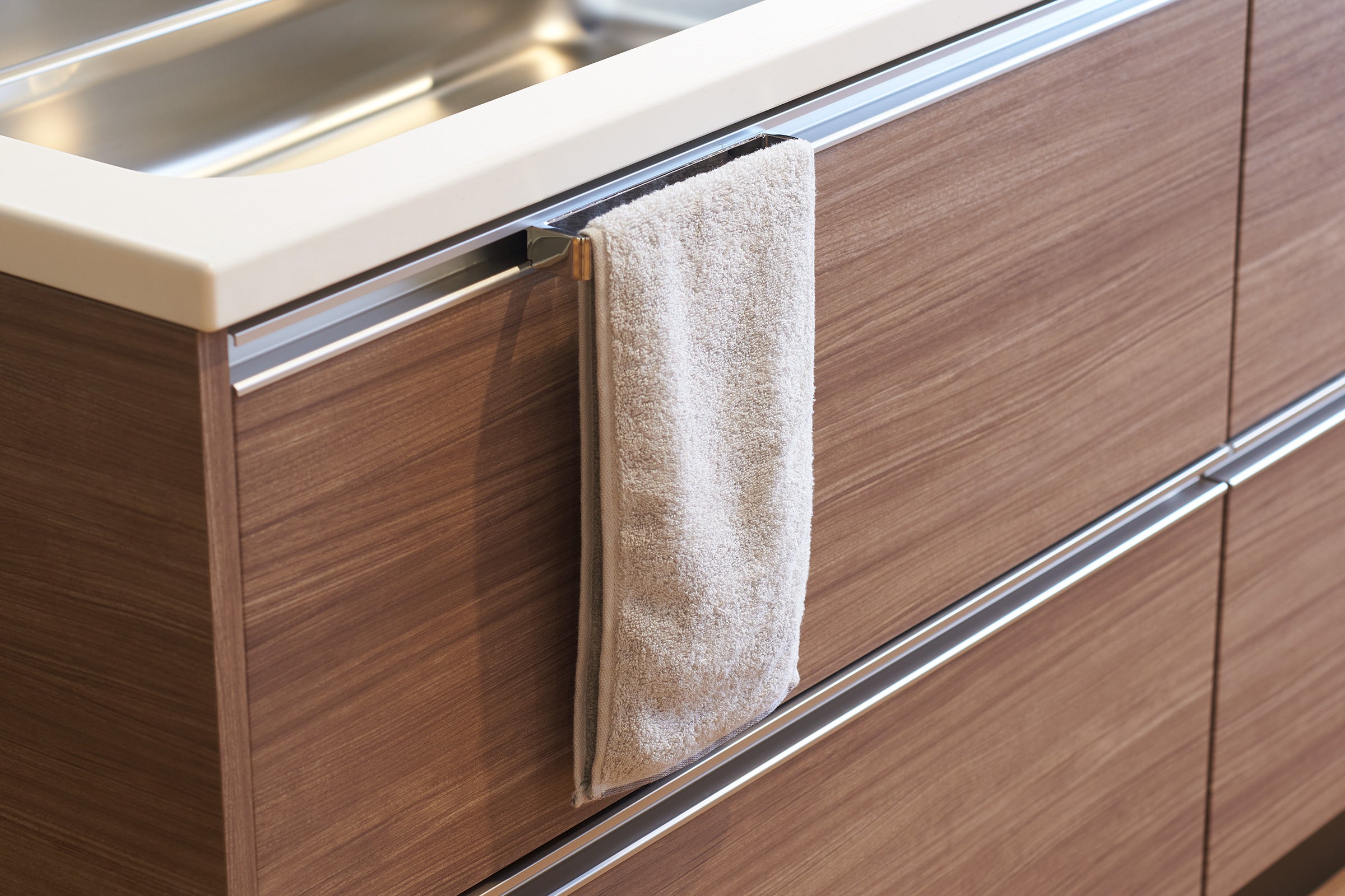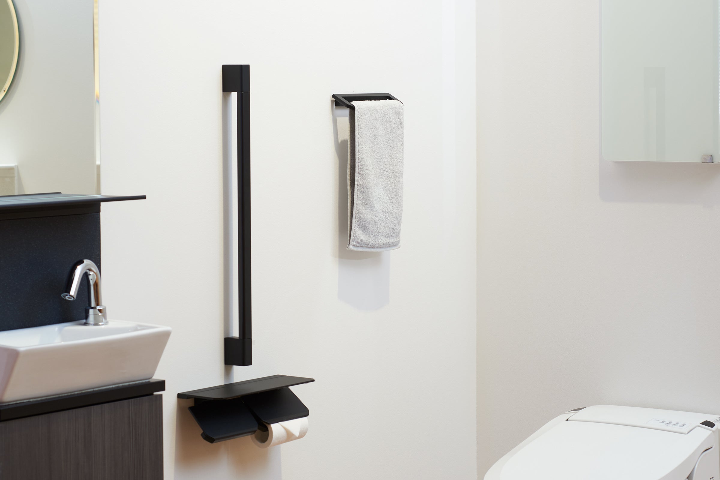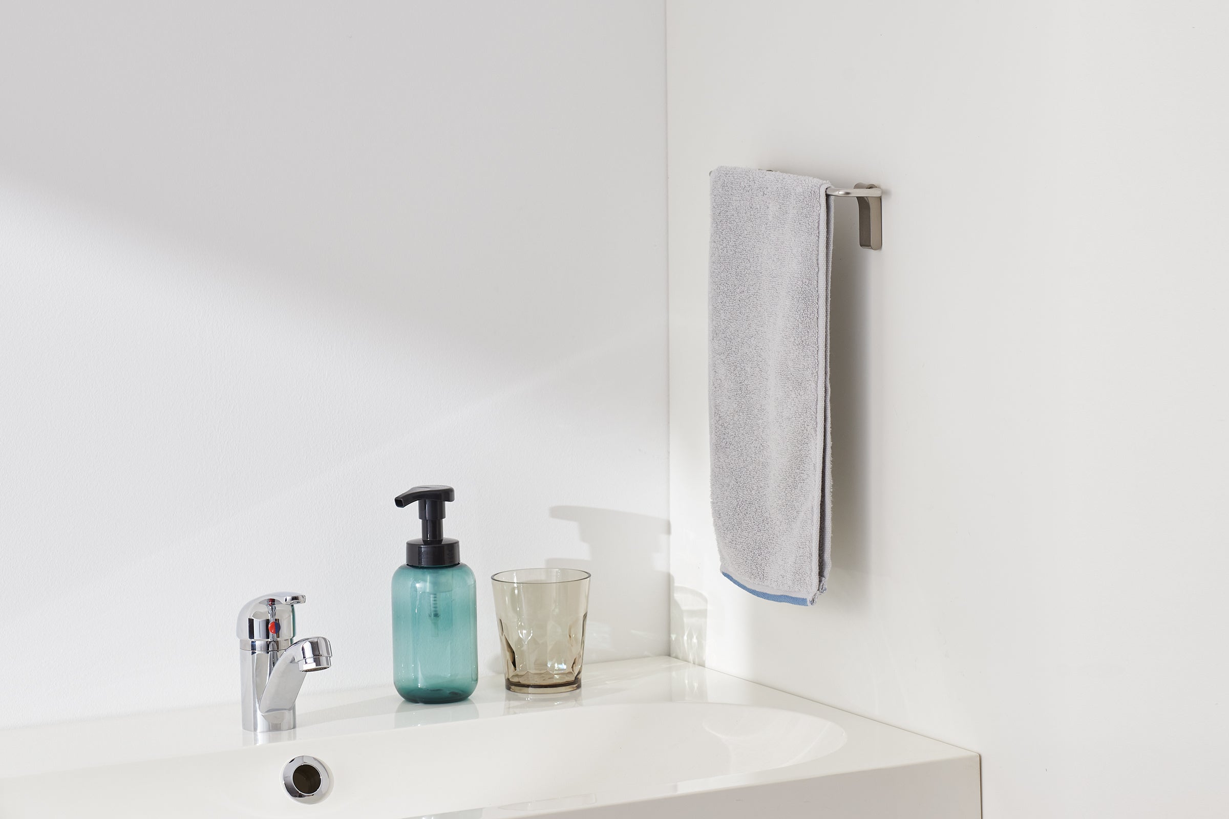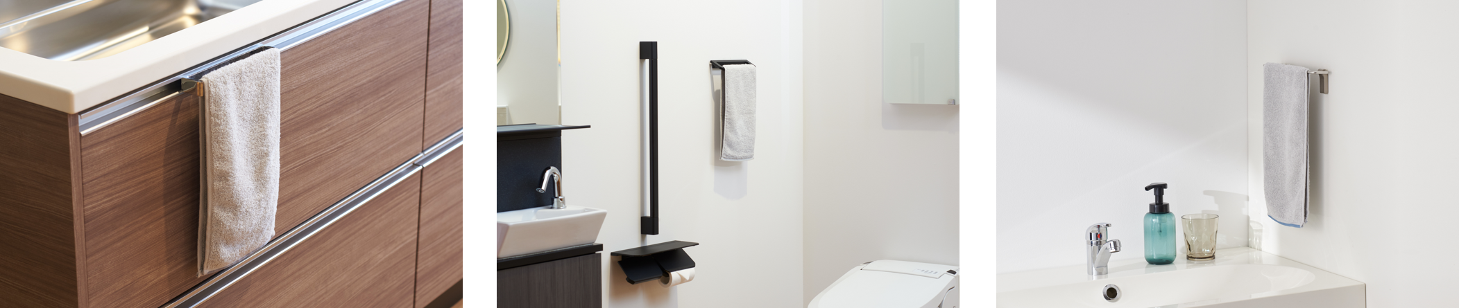 想像してみると、家で手を洗うシーンは、洗面所だけではなく、キッチン、トイレなど各ご家庭には、数か所のタオルバーがあり、毎回すべてのタオルを半分に折りたたんでセットするのは少しストレスかもしれません。また、タオルバーにかかっているタオルは、その内側や上の部分はあまり使われていないということに着目し、使うのに困らない程度の無駄のない長さにしています。コンパクトな設計にすることで、洗濯や収納時にかさばらないようなちょうど良いサイズ感となっております。
