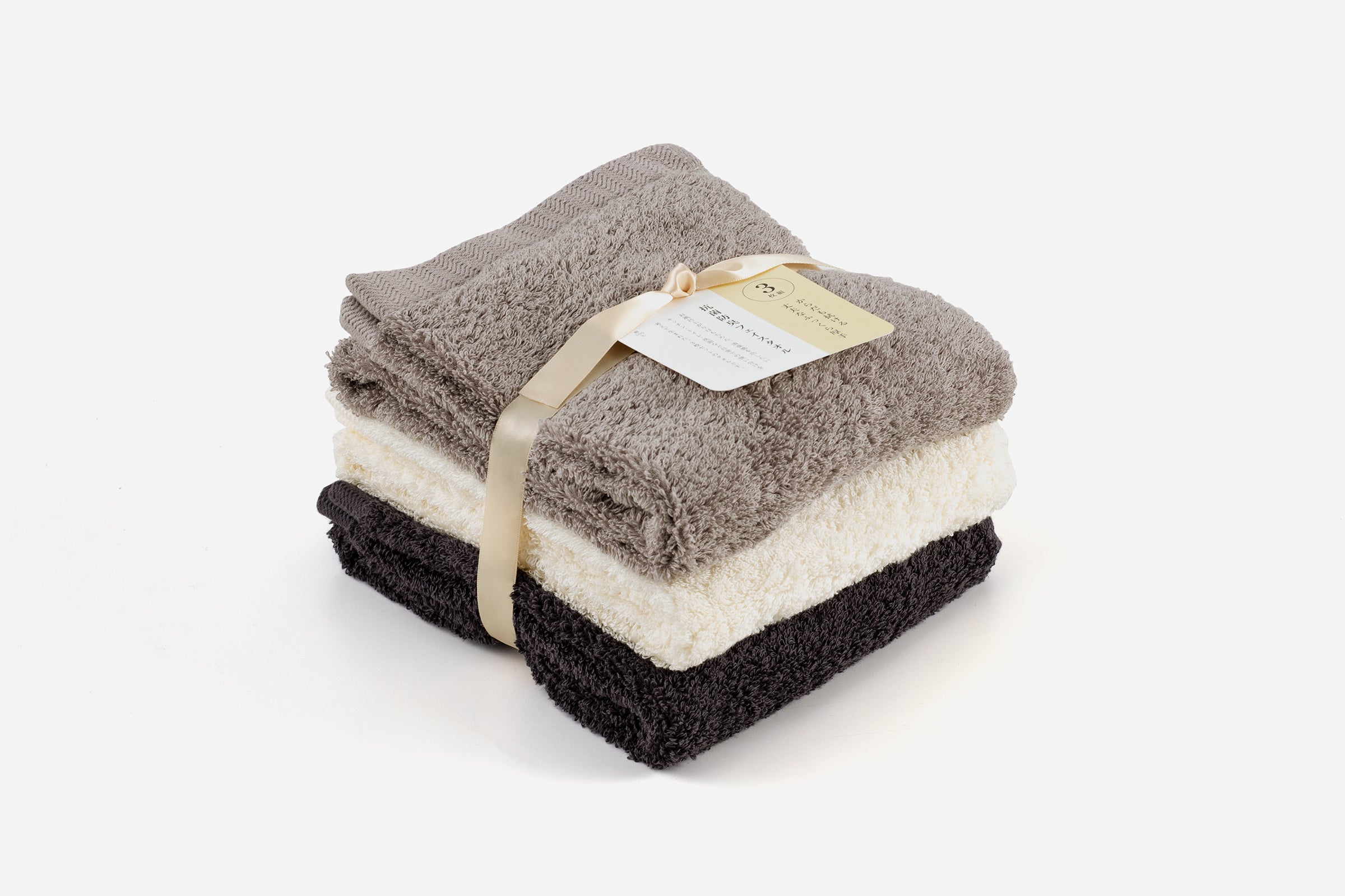 さらに、長時間同じものを使い続けていると臭いが気になりがちなタオルですが、生乾き臭の原因の1つとされているモラクセラ菌に対して効果のある抗菌加工を施しているため、衛生的にお使いいただくことができます。落ち着きのあるグレー色の3枚セットで、インテリアに馴染むことはもちろん、タオルを使う場面が多いキッチン・トイレ・洗面所のシーン別にタオルの縁の色で分けて使うことができるラインアップです。
