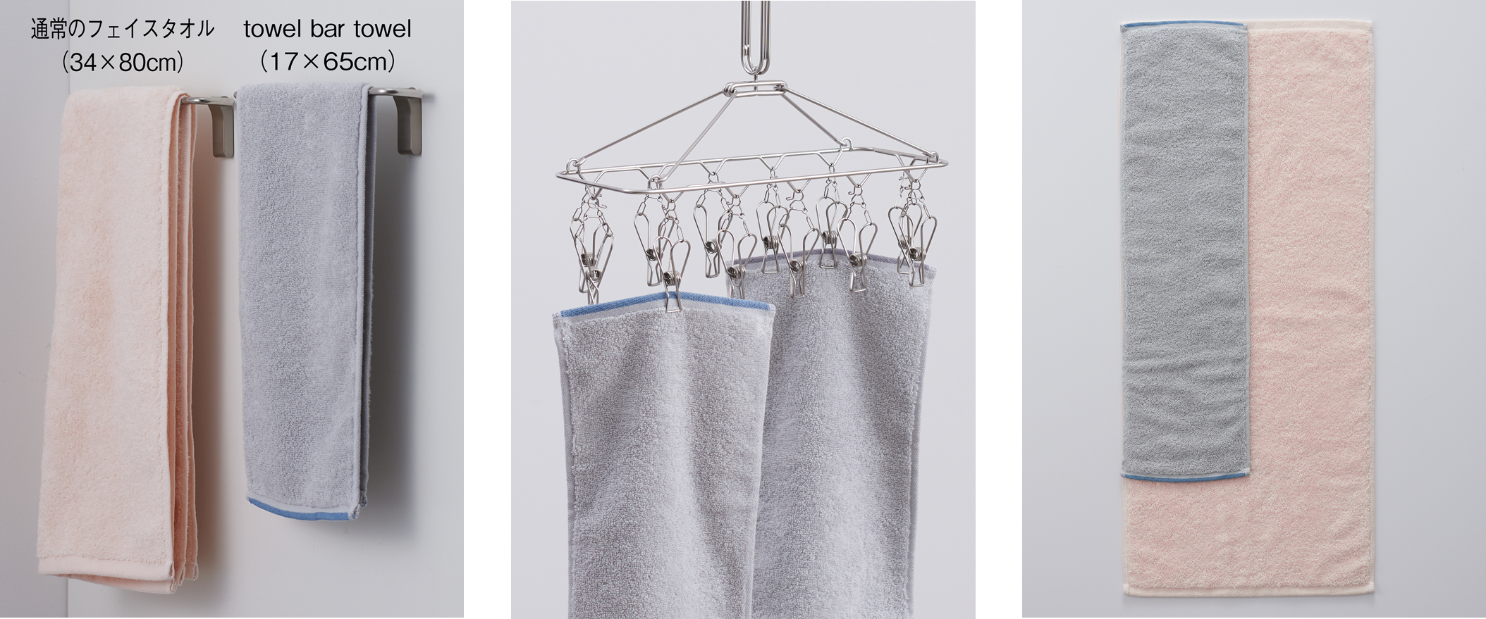 今回新しく登場する「抗菌防臭towel bar towel3枚セット」は、タオルバーにかける際のタオルを半分に折るという手間を減らしたい、手をふく時に使わない部分が多いというデザイナーが普段の生活から感じている煩わしさや思いから開発されました。
