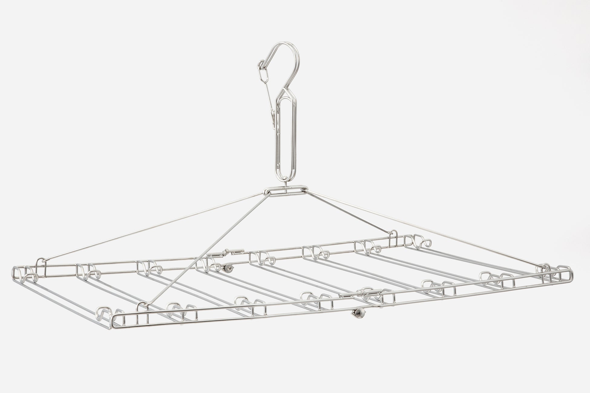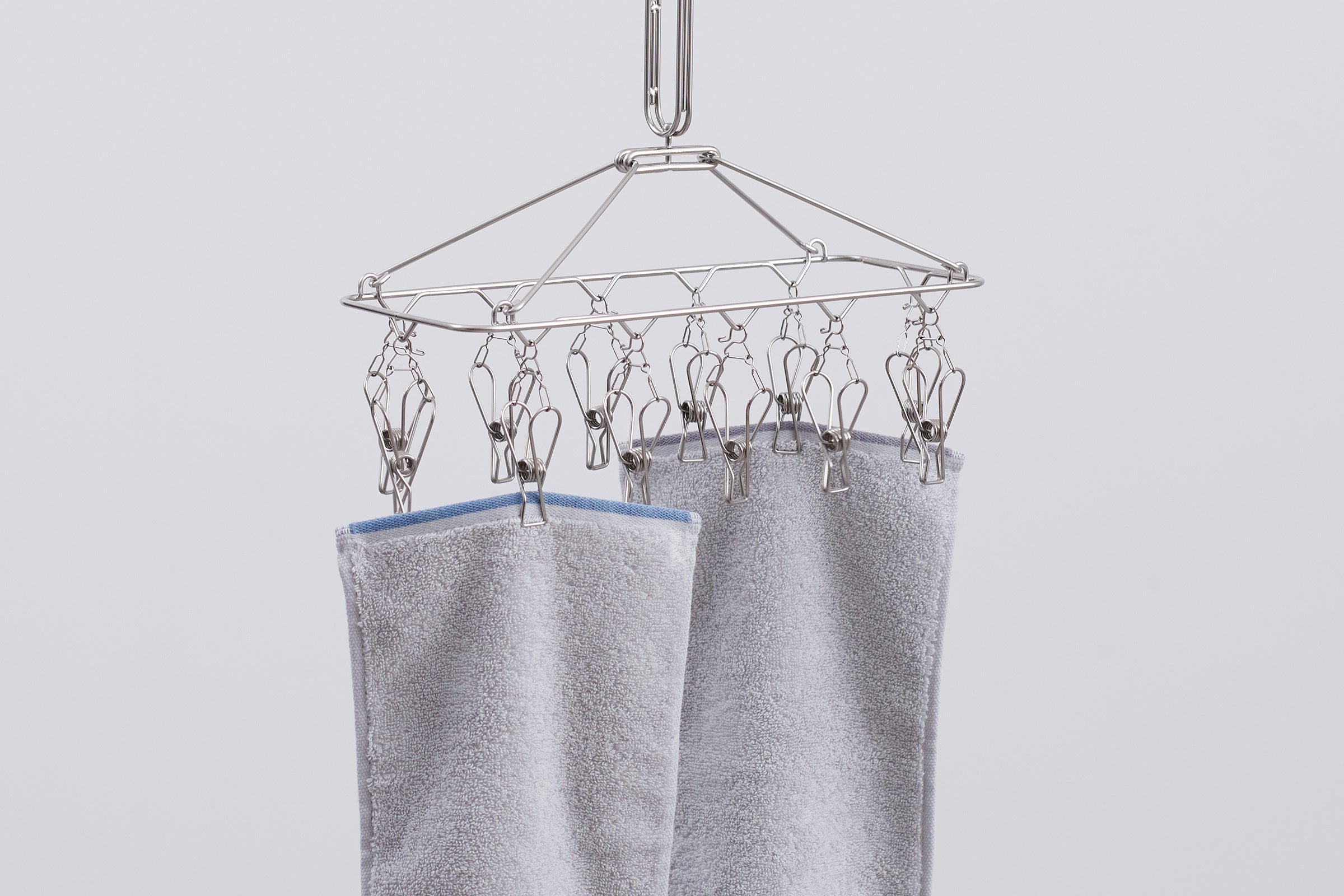 “タオル干し”に特化したハンガー。一般的なパラソルハンガーやピンチハンガーを使用した際に寄せられた不満を解決するアイテムとなっております。省スペースを実現するデザインはもちろん、形崩れを防止し均等に乾燥できる形状や、洗濯物を干したまま折りたためる仕様が特徴です。