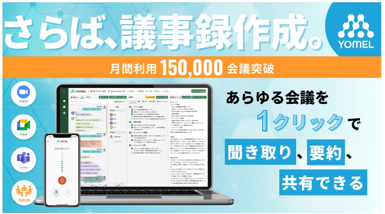 YOMELは、音声認識AI、話者識別AI、要約AIの3つのエンジンを搭載し、議事録作成を強力にサポートするツールです。オンライン、対面、ハイブリッドなど、あらゆる会議形式に対応し、会議内容を自動でテキスト化、話者を識別し、要点をわかりやすく要約します。PC操作が苦手な方でも簡単に使える直感的なUIUXで、効率的な会議進行と情報共有を実現します。