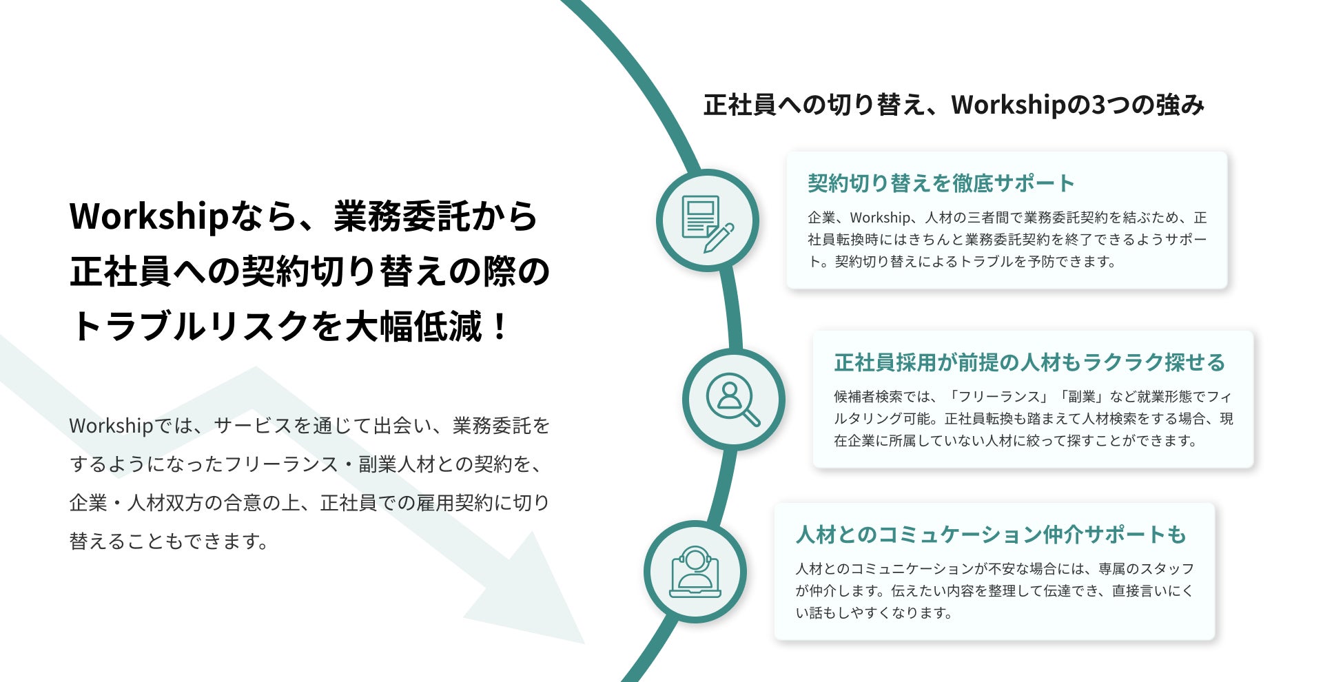 そのため、正社員(雇用契約)への切り替え時は必ずWorkshipが仲介。人材と企業の二者間契約ではないため、切り替え時のトラブルを防げます。