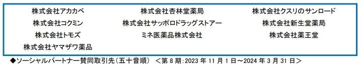 第8期における支援金額は、ソーシャルパートナー10社の2023年11月~2024年3月までの目薬(以下に詳細記載)の売上の一部、662,120円と同額を当社がマッチングし、合計1,324,240円となりました。ソーシャルパートナーをはじめ、皆様方の温かいお力添えのおかげで、このような支援の輪が広がりましたことを、心より感謝申し上げます。