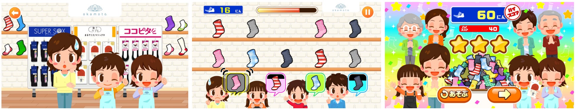靴下ショップの店員さんになってお客さまに合わせた靴下を見つけるゲームです。足の冷えや、靴下が脱げてしまうといった悩みに合わせて、お客さまが欲しい靴下と同じ絵柄の靴下を見つけてタップします。