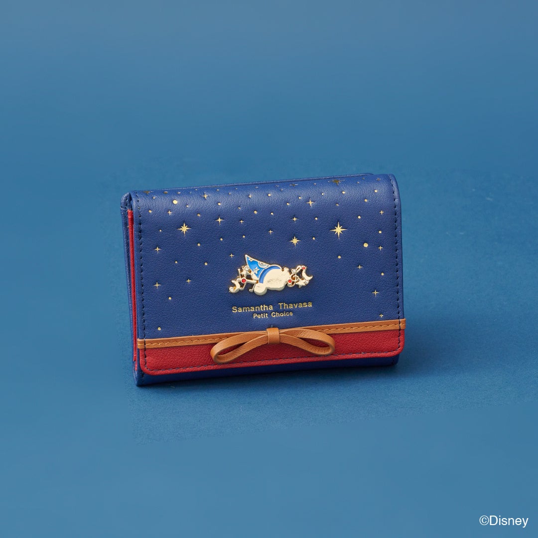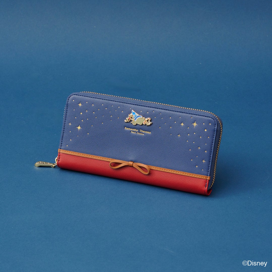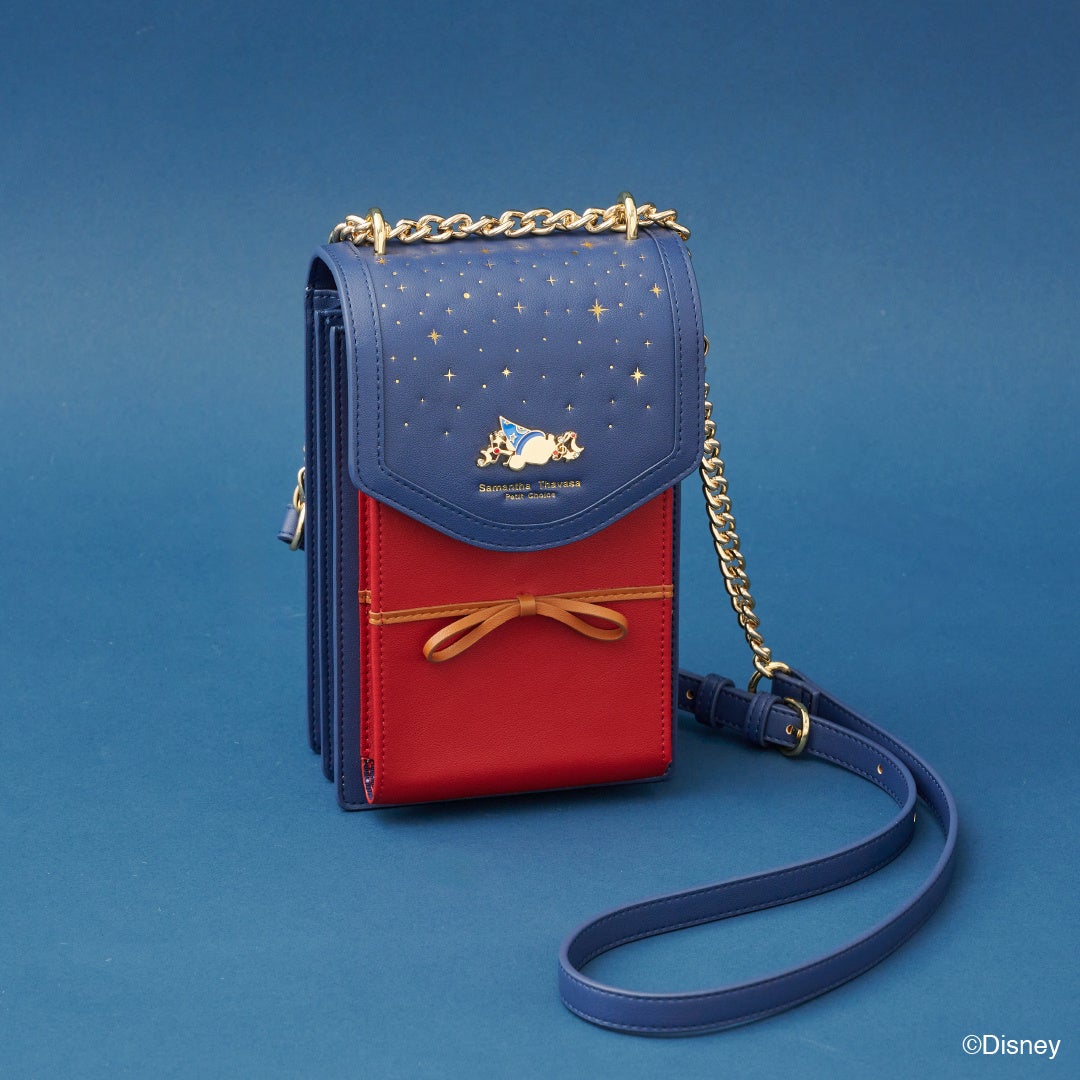 お財布とスマホショルダーはネイビーと赤のバイカラー配色にブラウンの結びリボンがポイント。「ミッキーマウス」が着ていた赤いマントとウエストの紐をイメージしたデザイン。フロントに魔法の帽子を被った「ミッキーマウス」をモチーフにしたオリジナル金具。