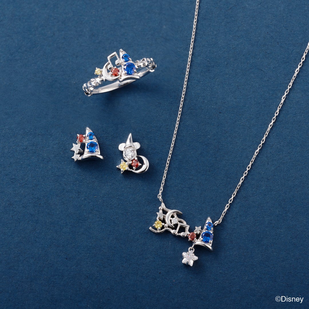 細かなモチーフには段差をつけて立体感を。ネックレスは「ミッキーマウス」がかける魔法の様子をイメージ。『ファンタジア』の夢が勇気をくれる、お守りのようなジュエリーです。