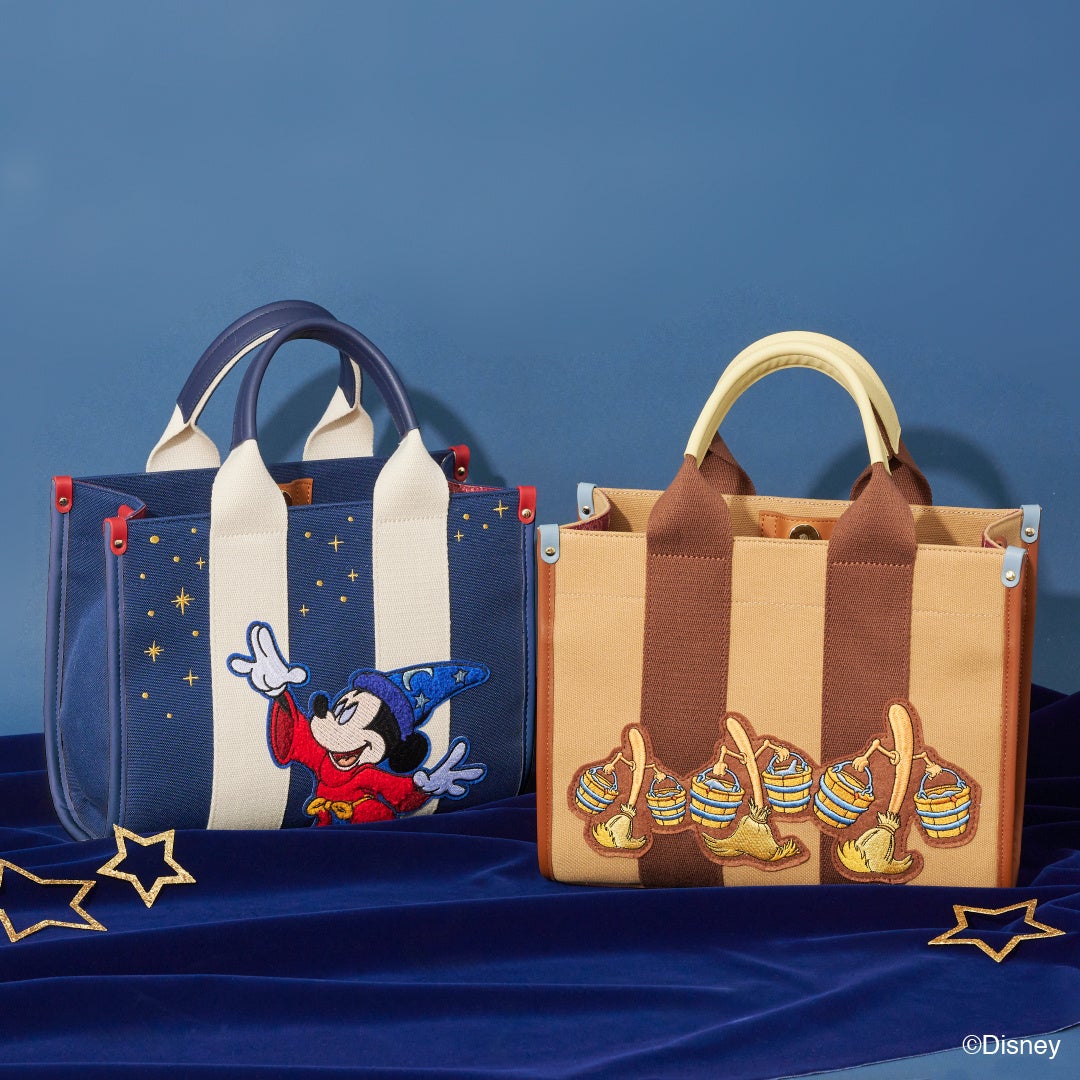 魔法をかけている「ミッキーマウス」や水汲みをしているほうきのアートがワッペンでデザインされたトートバッグ。物語のワンシーンを連想させるような、『ファンタジア』の世界観溢れるデザインに大注目。