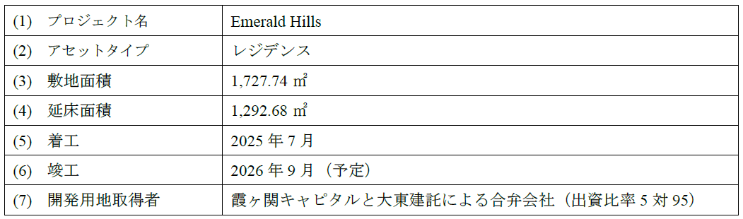 ドバイにおける不動産開発事業の始動においては、大東建託株式会社(本社:東京都港区、代表取締役 社長執行役員 CEO:竹内啓、以下「大東建託」)を第一号案件の共同パートナーとして、大東建託および当社の合弁会社を設立し、当社子会社が保有するドバイの開発プロジェクト「Emerald Hills」の開発用地を、本合弁会社へ売却決済いたしました。なお、本件に関わるプロジェクトマネジメント業務を当社100%子会社であるKME Project Management L.L.Cにて受託いたします。