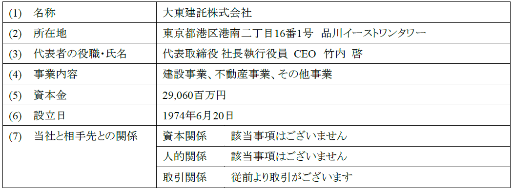 本件の共同パートナーである大東建託は、賃貸住宅建設で国内最大手の企業であり、豊富な資金力と不動産投資に関する深い知見を有しており、設計・販売・管理などの各分野において当社との強みを補完し合う体制が整っております。当社と大東建託との間では両者の不動産開発事業(日本国内外における不動産開発事業を含む)に関して相互に協力関係を醸成し、推進していくことを趣旨とする共同事業に関する覚書が締結されております。