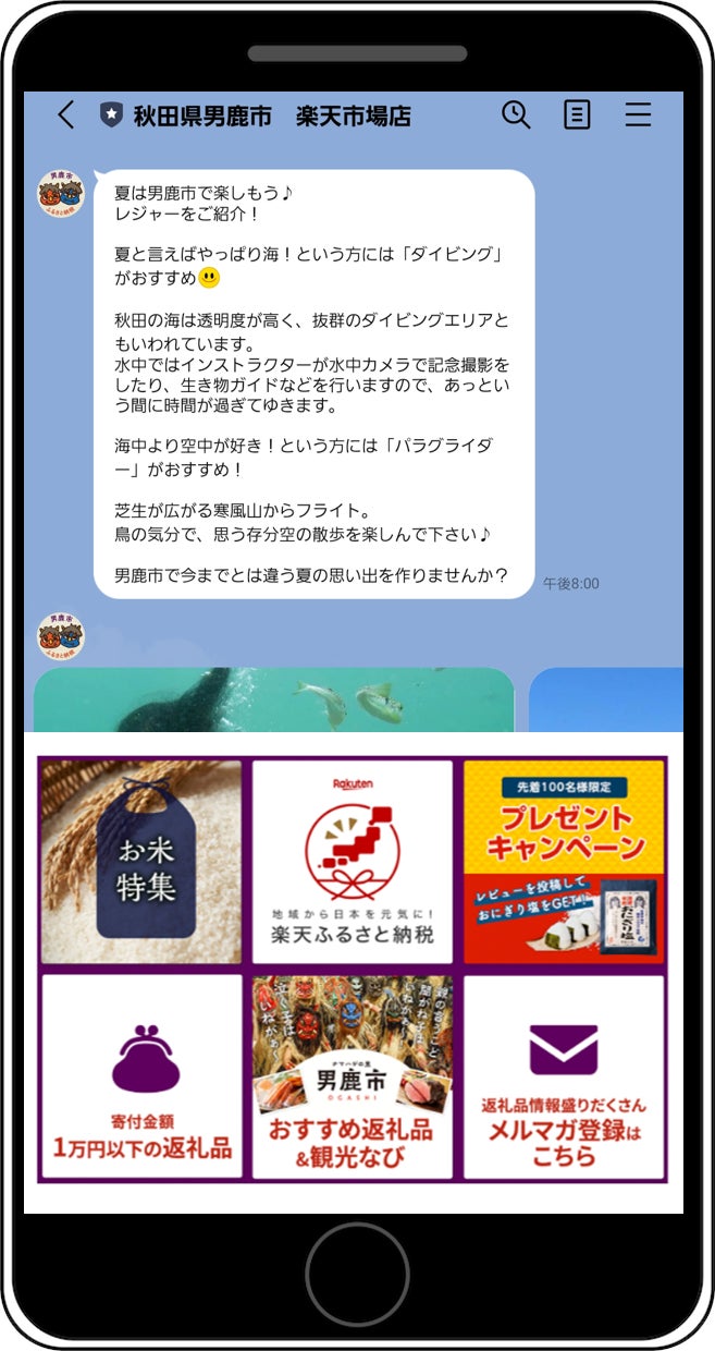 この「男鹿市ふるさと納税LINE公式アカウント」では、男鹿市のふるさと納税返礼品情報を同市の四季に合わせた特産品や観光などの情報と共に発信し、同市に興味を持つ方に対し認知拡大とコミュニケーションの構築、新たなファンの獲得や醸成に繋げていくことを目的としています。またこの度、秋田県を中心に降り続いた豪雨による被害の支援募集についても情報発信を行いました。公式アカウントではこのように、適時に同市と同市を愛するファンを繋げていく役割も担っていきたいと考えています。
