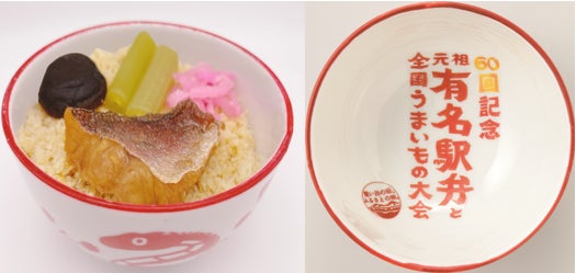 60回目を迎えた今大会の記念どんぶりを手掛けるのは1889年の創業、「元祖鯛めし」で知られる「東海軒」。醤油の味付けご飯に、独自の製法による甘い味付けの鯛のそぼろをまぶした「元祖鯛めし」に、ヒメ鯛の煮付けをのせて仕上げます。同店ならではのふんわりとした鯛そぼろの食感にもこだわっています。