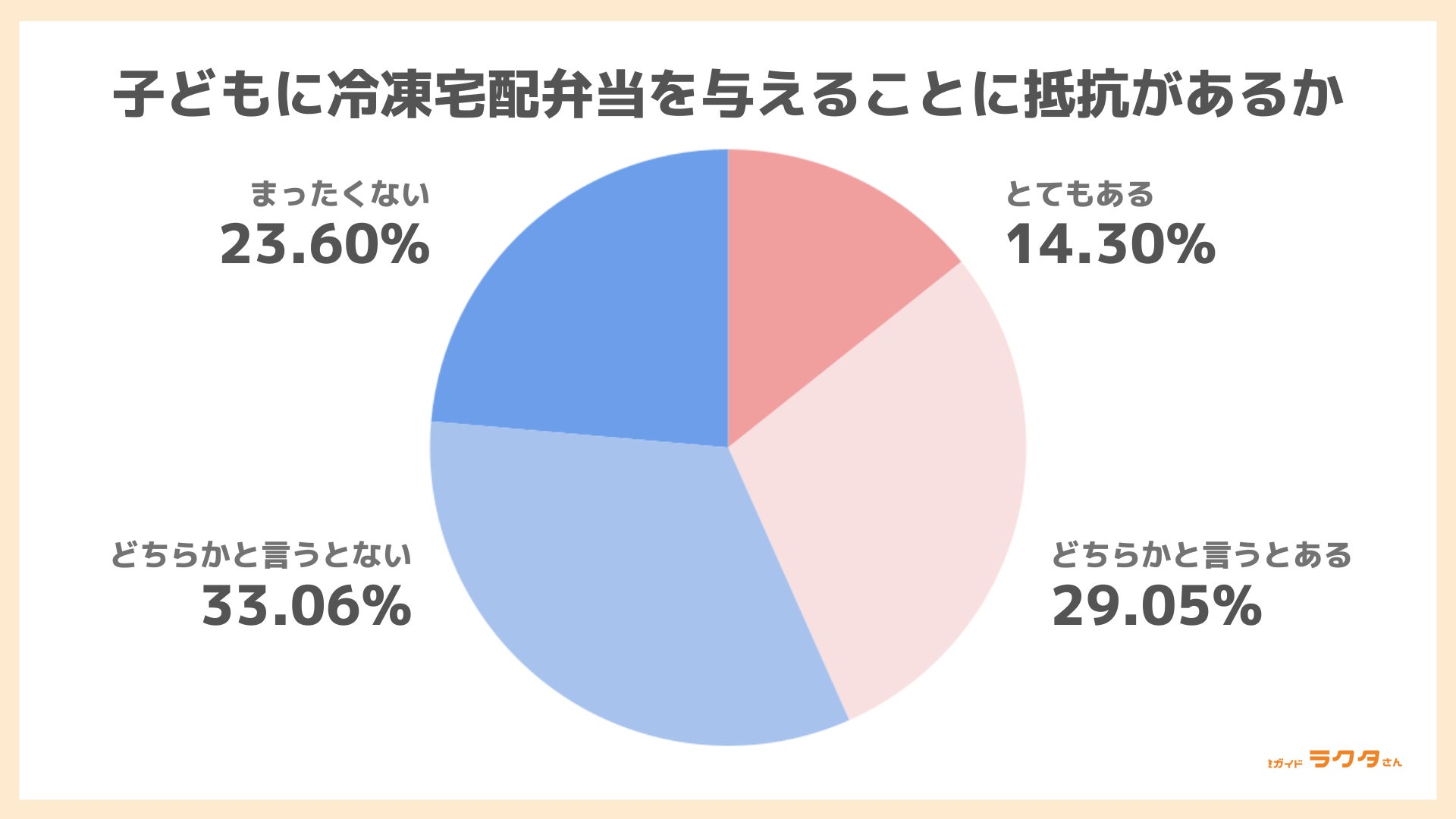 子どもに冷凍宅配弁当を与えることに抵抗があるかどうかを尋ねた結果、最も多かった回答は「どちらかと言うとない」で33.06%でした。「まったくない」と合わせると、56.66%の人が抵抗がないと答えました。