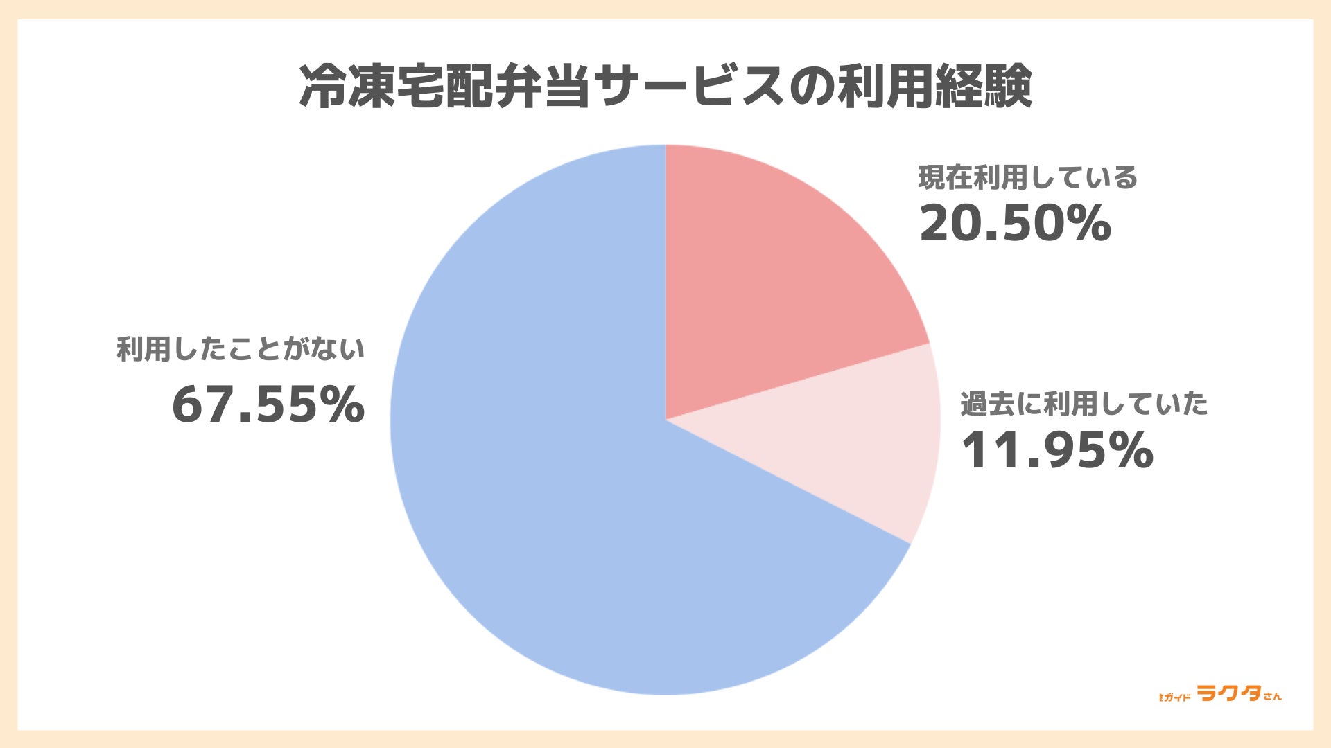冷凍宅配弁当サービスを利用したことがあるかを尋ねたところ、「現在利用している」が20.50%、「過去に利用していた」が11.95%。約3割は利用経験がありました。