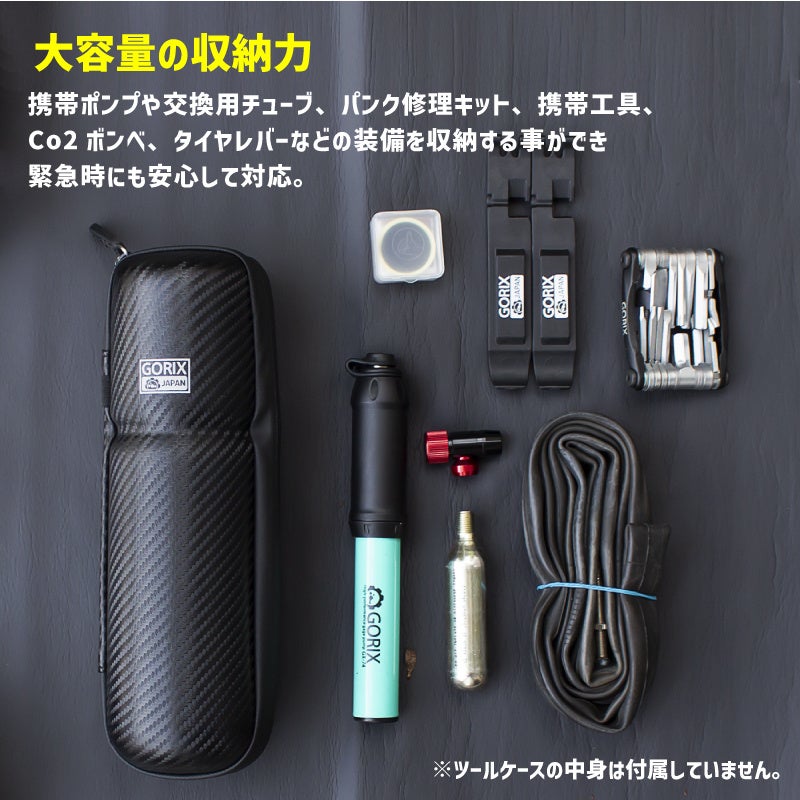 携帯ポンプや交換用チューブ、パンク修理キット、携帯工具、Co2ボンベ、タイヤレバーなどの装備を収納する事ができ緊急時にも安心して対応。