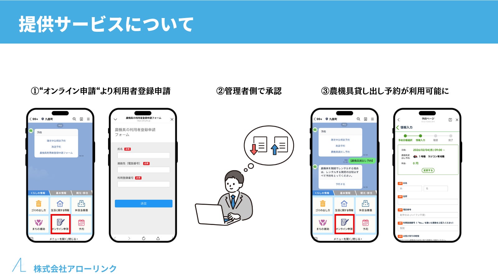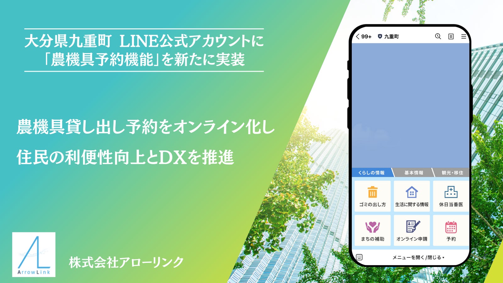 この度、株式会社アローリンク(代表取締役:蓬莱和真)と株式会社ネクストワン(代表取締役兼CEO:佐藤直樹)は、大分県九重町(町長:日野康志)が、九重町LINE公式アカウントにおいて、新たに「農機具貸し出し予約」を実装し、運用を開始したことをお知らせします。