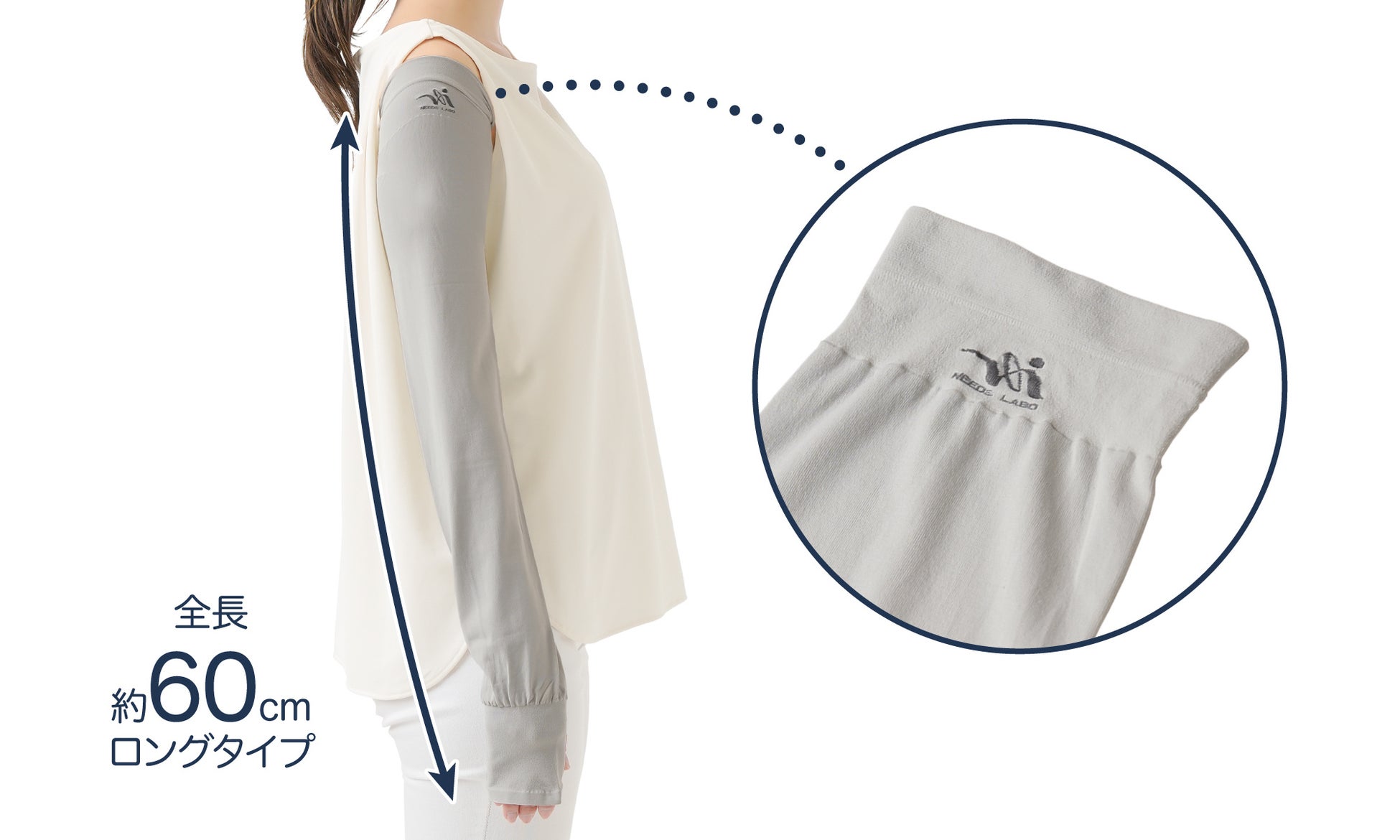 全長約60㎝のロングタイプ!腕全体をすっぽり覆って紫外線からしっかりガード。ゆったりしているので肌に密着しにくく、サラッと快適♪