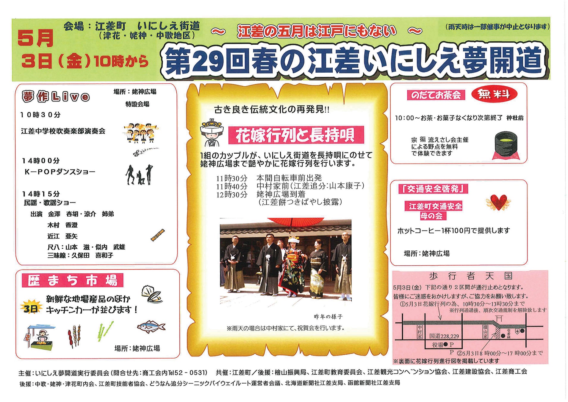 また、同日は、屋外のステージ企画や「花嫁行列」、歴まち市場などが行われる「春の江差いにしえ夢開道」(主催:江差町歴まち商店街協同組合)も開催されておりますので、ぜひお楽しみください。【江差町歴まち商店街協同組合HPへ】